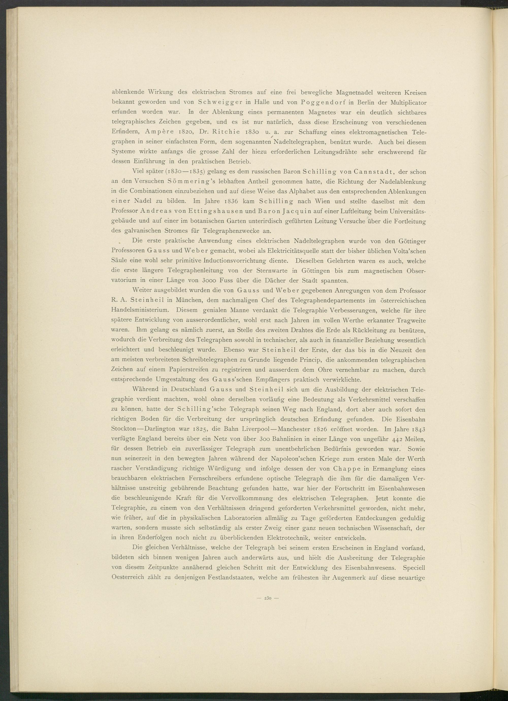 Weiter ausgebildet wurden die von Gauss und Weber gegebenen Anregungen von dem Professor R. A. Steinheil in München, dem nachmaligen Chef des Telegraphendepartements im österreichischen Handelsministerium. Diesem genialen Manne verdankt die Telegraphie Verbesserungen, welche für ihre spätere Entwicklung von ausserordentlicher, wohl erst nach Jahren im vollen Werthe erkannter Tragweite waren. Ihm gelang es nämlich zuerst, an Stelle des zweiten Drahtes die Erde als Rückleitung zu benützen, wodurch die Verbreitung des Telegraphen sowohl in technischer, als auch in finanzieller Beziehung wesentlich erleichtert und beschleunigt wurde. Ebenso war Steinheil der Erste, der das bis in die Neuzeit den am meisten verbreiteten Schreibtelegraphen zu Grunde liegende Princip, die ankommenden telegraphischen Zeichen auf einem Papierstreifen zu registriren und ausserdem dem Ohre vernehmbar zu machen, durch entsprechende Umgestaltung des Gauss’schen Empfängers praktisch verwirklichte.