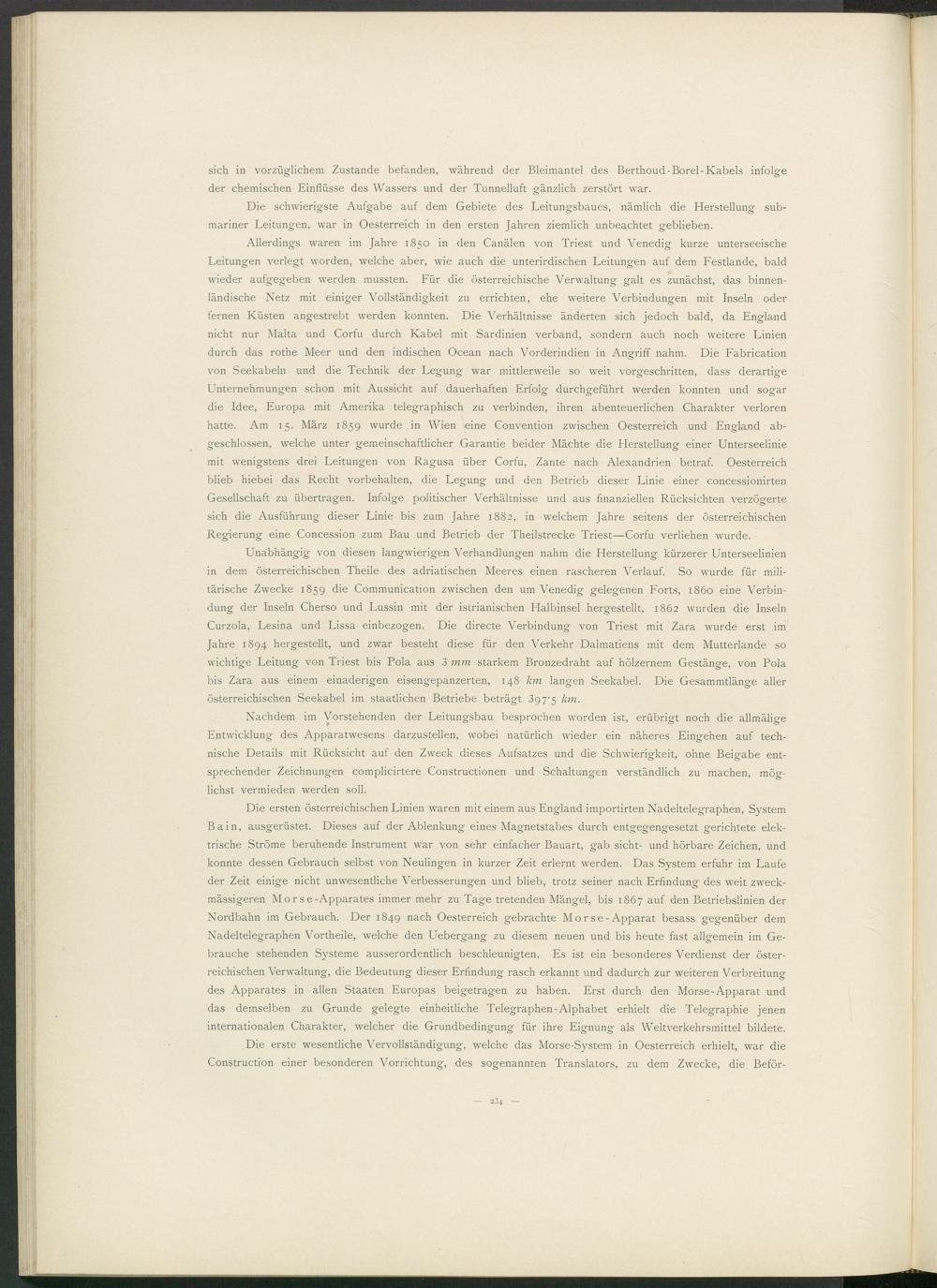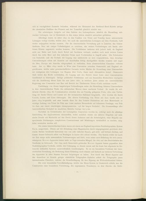 Unabhängig von diesen langwierigen Verhandlungen nahm die Herstellung kürzerer Unterseelinien in dem österreichischen Theile des adriatischen Meeres einen rascheren Verlauf. So wurde für militärische Zwecke 1859 die Communication zwischen den um Venedig gelegenen Forts, 1860 eine Verbindung der Inseln Cherso und Lussin mit der iscrianischen Halbinsel hergestellt, 1862 wurden die Inseln Curzola, Lesina und Lissa einbezogen. Die directe Verbindung von Triest mit Zara wurde erst im Jahre 1894 hergestellt, und zwar besteht diese für den Verkehr Dalmatiens mit dem Mutterlande so wichtige Leitung von Triest bis Pola aus 3 mm starkem Bronzedraht auf hölzernem Gestänge, von Pola bis Zara aus einem einaderigen eisengepanzerten, 148 km langen Seekabel. Die Gesammtlänge aller österreichischen Seekabel im staatlichen Betriebe beträgt 3 g 7'5 km.