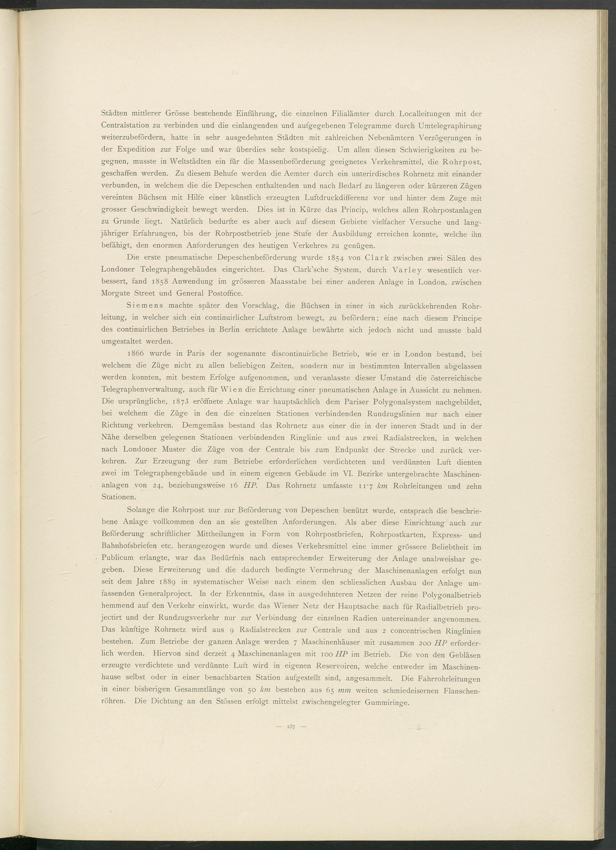 Städten mittlerer Grösse bestehende Einführung, die einzelnen Filialämter durch Localleitungen mit der Centralstation zu verbinden und die einlangenden und aufgegebenen Telegramme durch Umtelegraphirung weiterzubefördern, hatte in sehr ausgedehnten Städten mit zahlreichen Nebenämtern Verzögerungen in der Expedition zur Folge und war überdies sehr kostspielig. Um allen diesen Schwierigkeiten zu begegnen, musste in Weltstädten ein für die Massenbeförderung geeignetes Verkehrsmittel, die Rohrpost, geschaffen werden. Zu diesem Behufe werden die Aemter durch ein unterirdisches Rohrnetz mit einander verbunden, in welchem die die Depeschen enthaltenden und nach Bedarf zu längeren oder kürzeren Zügen vereinten Büchsen mit Hilfe einer künstlich erzeugten Luftdruckdifferenz vor und hinter dem Zuge mit grosser Geschwindigkeit bewegt werden. Dies ist in Kürze das Princip, welches allen Rohrpostanlagen zu Grunde liegt. Natürlich bedurfte es aber auch auf diesem Gebiete vielfacher Versuche und lang- jähriger Erfahrungen, bis der Rohrpostbetrieb jene Stufe der Ausbildung erreichen konnte, welche ihn befähigt, den enormen Anforderungen des heutigen Verkehres zu genügen.