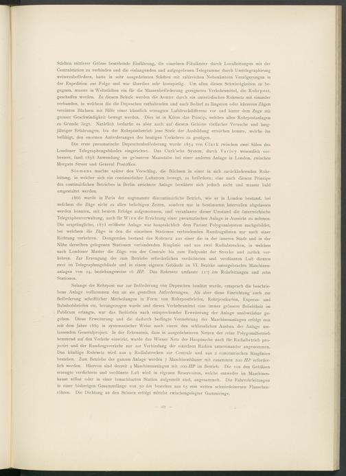 Solange die Rohrpost nur zur Beförderung von Depeschen benützt wurde, entsprach die beschriebene Anlage vollkommen den an sie gestellten Anforderungen. Als aber diese Einrichtung auch zur Beförderung schriftlicher Mittheilungen in Form von Rohrpostbriefen, Rohrpostkarten, Express- und Bahnhofsbriefen etc. herangezogen wurde und dieses Verkehrsmittel eine immer grössere Beliebtheit im Publicum erlangte, war das Bedürfnis nach entsprechender Erweiterung der Anlage unabweisbar gegeben. Diese Erweiterung und die dadurch bedingte Vermehrung der Maschinenanlagen erfolgt nun seit dem Jahre 1889 in systematischer Weise nach einem den schliesslichen Ausbau der Anlage umfassenden Generalproject. In der Erkenntnis, dass in ausgedehnteren Netzen der reine Polygonalbetrieb hemmend auf den Verkehr einwirkt, wurde das Wiener Netz der Hauptsache nach für Radialbetrieb pro- jectirt und der Rundzugsverkehr nur zur Verbindung der einzelnen Radien untereinander angenommen. Das künftige Rohrnetz wird aus 9 Radialstrecken zur Centrale und aus 2 concentrischen Ringlinien bestehen. Zum Betriebe der ganzen Anlage werden 7 Maschinenhäuser mit zusammen 200 HP erforderlich werden. Hiervon sind derzeit 4 Maschinenanlagen mit 100 HP im Betrieb. Die von den Gebläsen erzeugte verdichtete und verdünnte Luft wird in eigenen Reservoiren, welche entweder im Maschinenhause selbst oder in einer benachbarten Station aufgestellt sind, angesammelt. Die Fahrrohrleitungen in einer bisherigen Gesammtlänge von - 50 km bestehen aus 65 mm weiten schmiedeisernen Flanschenröhren. Die Dichtung an den Stössen erfolgt mittelst zwischengelegter Gummiringe.