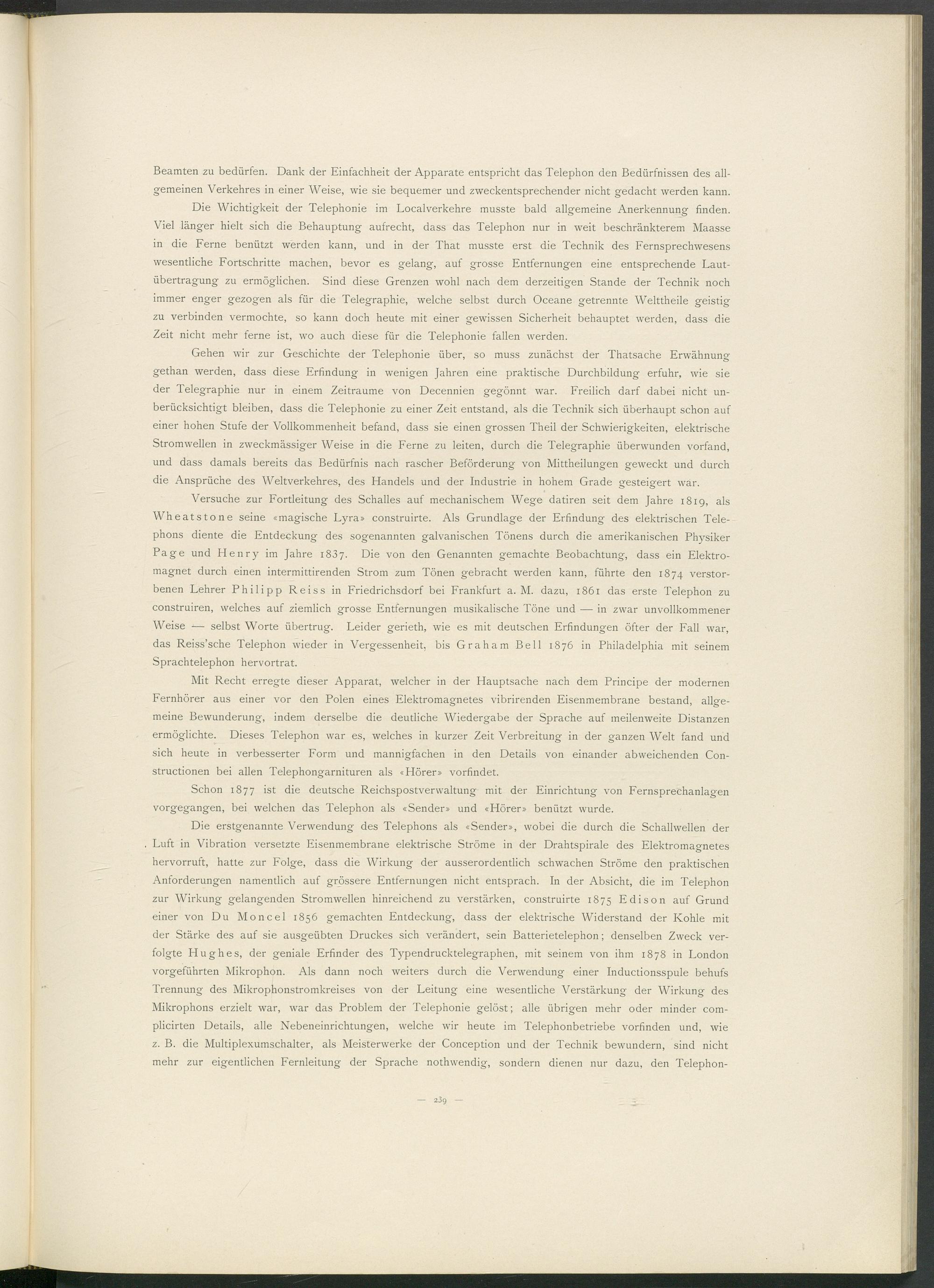 Versuche zur Fortleitung des Schalles auf mechanischem Wege datiren seit dem Jahre 1819, als Wheatstone seine «magische Lyra» construirte. Als Grundlage der Erfindung des elektrischen Telephons diente die Entdeckung des sogenannten galvanischen Tönens durch die amerikanischen Physiker Page und Henry im Jahre 1837. Die von den Genannten gemachte Beobachtung, dass ein Elektromagnet durch einen intermittirenden Strom zum Tönen gebracht werden kann, führte den 1874 verstorbenen Lehrer Philipp Reiss in Friedrichsdorf bei Frankfurt a. M. dazu, 1861 das erste Telephon zu construiren, welches auf ziemlich grosse Entfernungen musikalische Töne und — in zwar unvollkommener Weise — selbst Worte übertrug. Leider gerieth, wie es mit deutschen Erfindungen öfter der Fall war, das Reiss’sche Telephon wieder in Vergessenheit, bis Graham Bell 1876 in Philadelphia mit seinem Sprachtelephon hervortrat.