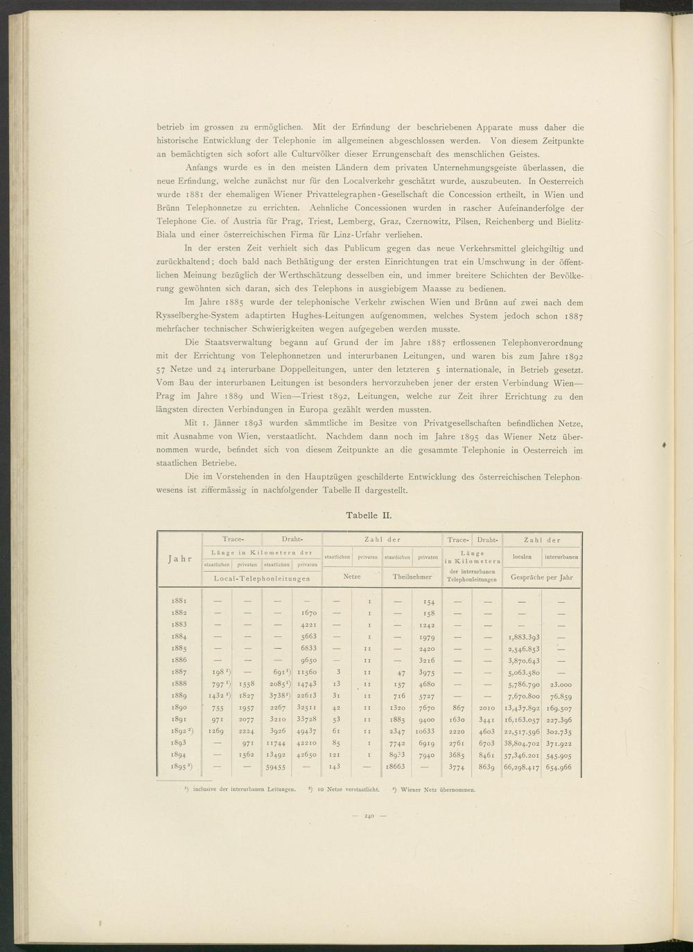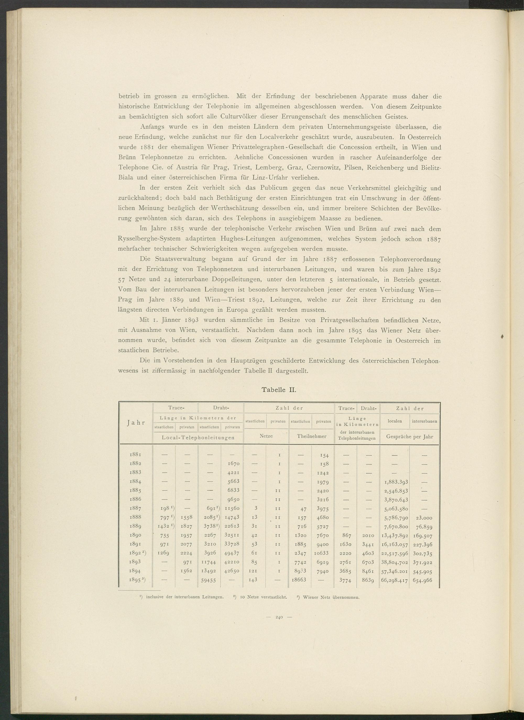 Mit 1. Jänner 1893 wurden sämmtliche im Besitze von Privatgesellschaften befindlichen Netze, mit Ausnahme von Wien, verstaatlicht. Nachdem dann noch im Jahre 1895 das Wiener Netz übernommen wurde, befindet sich von diesem Zeitpunkte an die gesammte Telephonie in Oesterreich im staatlichen Betriebe.