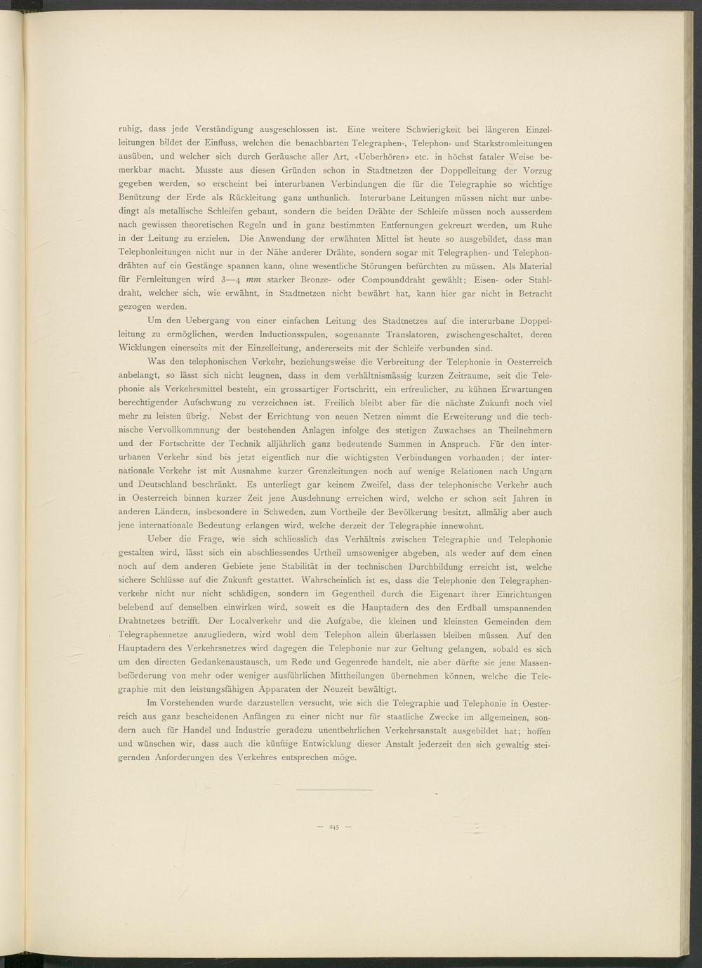 mehr zu leisten übrig. Nebst der Errichtung von neuen Netzen nimmt die Erweiterung und die technische Vervollkommnung der bestehenden Anlagen infolge des stetigen Zuwachses an Theilnehmern und der Fortschritte der Technik alljährlich ganz bedeutende Summen in Anspruch. Für den interurbanen Verkehr sind bis jetzt eigentlich nur die wichtigsten Verbindungen vorhanden; der internationale Verkehr ist mit Ausnahme kurzer Grenzleitungen noch auf wenige Relationen nach Ungarn und Deutschland beschränkt. Es unterliegt gar keinem Zweifel, dass der telephonische Verkehr auch in Oesterreich binnen kurzer Zeit jene Ausdehnung erreichen wird, welche er schon seit Jahren in anderen Ländern, insbesondere in Schweden, zum Vortheile der Bevölkerung besitzt, allmälig aber auch jene internationale Bedeutung erlangen wird, welche derzeit der Telegraphie innewohnt.