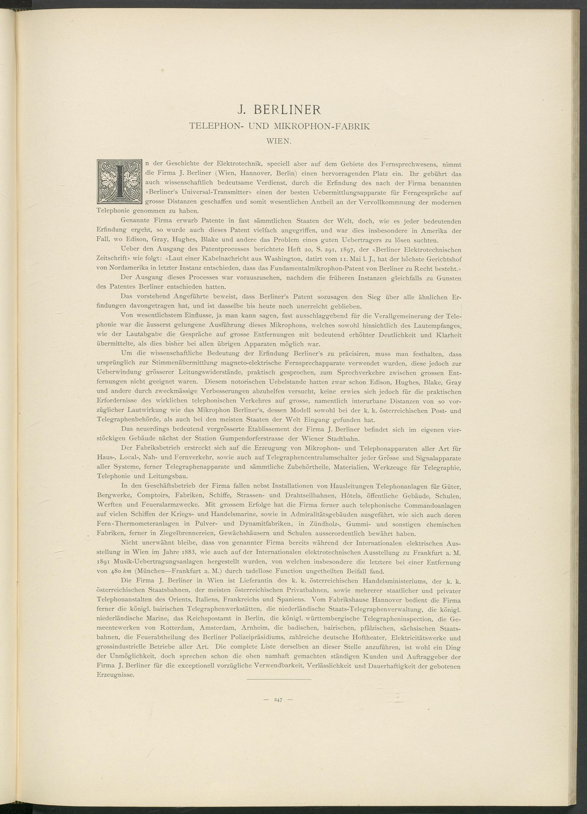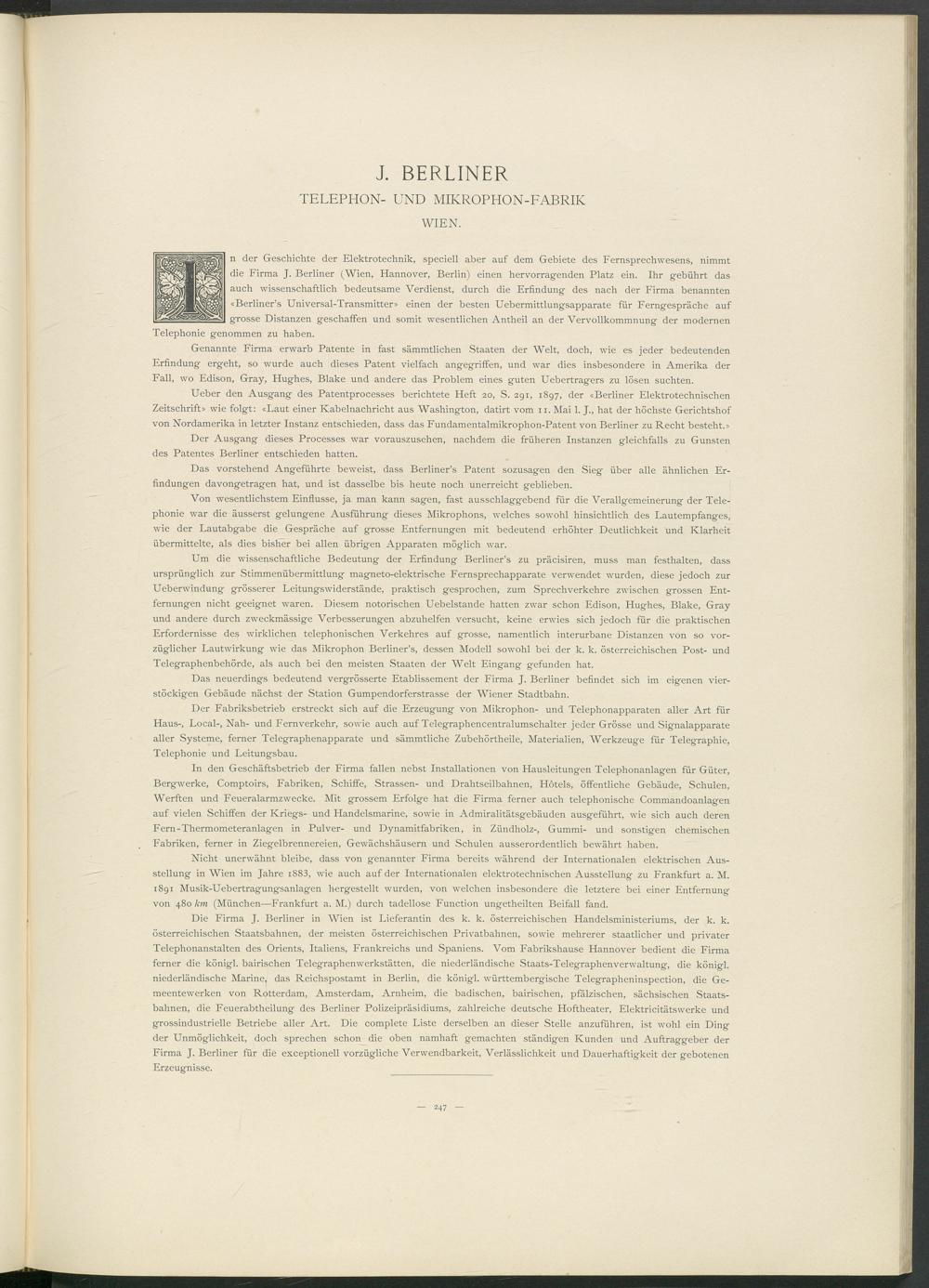 Die Firma J. Berliner in Wien ist Lieferantin des k. k. österreichischen Handelsministeriums, der k. k. österreichischen Staatsbahnen, der meisten österreichischen Privatbahnen, sowie mehrerer staatlicher und privater Telephonanstalten des Orients, Italiens, Frankreichs und Spaniens. Vom Fabrikshause Hannover bedient die Firma ferner die königl. bairischen Telegraphenwerkstätten, die niederländische Staats-Telegraphenverwaltung, die königl. niederländische Marine, das Reichspostamt in Berlin, die königl. württembergische Telegrapheninspection, die Ge- meentewerken von Rotterdam, Amsterdam, Arnheim, die badischen, bairischen, pfälzischen, sächsischen Staatsbahnen, die Feuerabtheilung des Berliner Polizeipräsidiums, zahlreiche deutsche Hoftheater, Elektricitätswerke und grossindustrielle Betriebe aller Art. Die complete Liste derselben an dieser Stelle anzuführen, ist wohl ein Ding der Unmöglichkeit, doch sprechen schon die oben namhaft gemachten ständigen Kunden und Auftraggeber der Firma J. Berliner für die exceptionell vorzügliche Verwendbarkeit, Verlässlichkeit und Dauerhaftigkeit der gebotenen Erzeug'nisse.