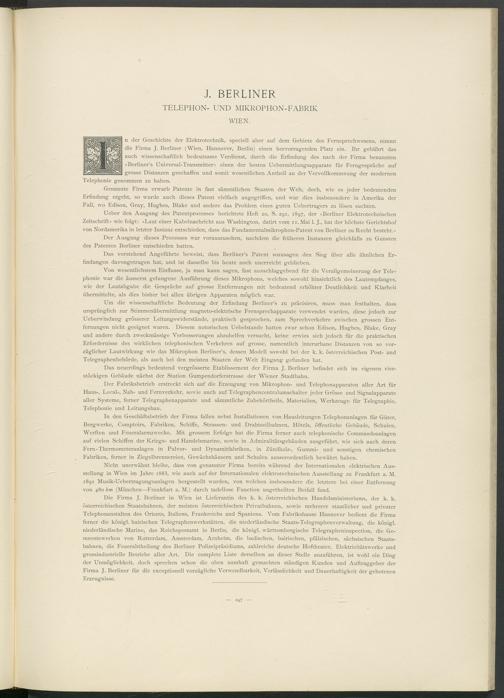 n der Geschichte der Elektrotechnik, speciell aber auf dem Gebiete des Fernsprechwesens, nimmt die Firma J. Berliner (Wien, Hannover, Berlin) einen hervorragenden Platz ein. Ihr gebührt das auch wissenschaftlich bedeutsame Verdienst, durch die Erfindung des nach der Firma benannten «Berliner’s Universal-Transmitter» einen der besten Uebermittlungsapparate für Ferngespräche auf grosse Distanzen geschaffen und somit wesentlichen Antheil an der Vervollkommnung der modernen Telephonie genommen zu haben.