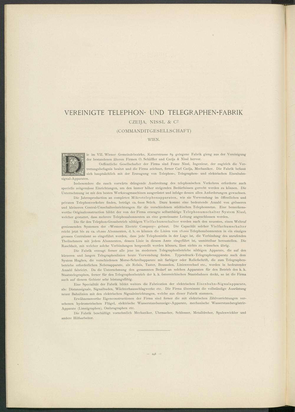 Oeffentliche Gesellschafter der Firma sind Franz Nissl, Ingenieur, der zugleich die Vertretungsbefugnis besitzt und die Firma zeichnet, ferner Carl Czeija, Mechaniker. Die Fabrik befasst sich hauptsächlich mit der Erzeugung von Telephon-, Telegraphen- und elektrischen Eisenbahnsignal-Apparaten.