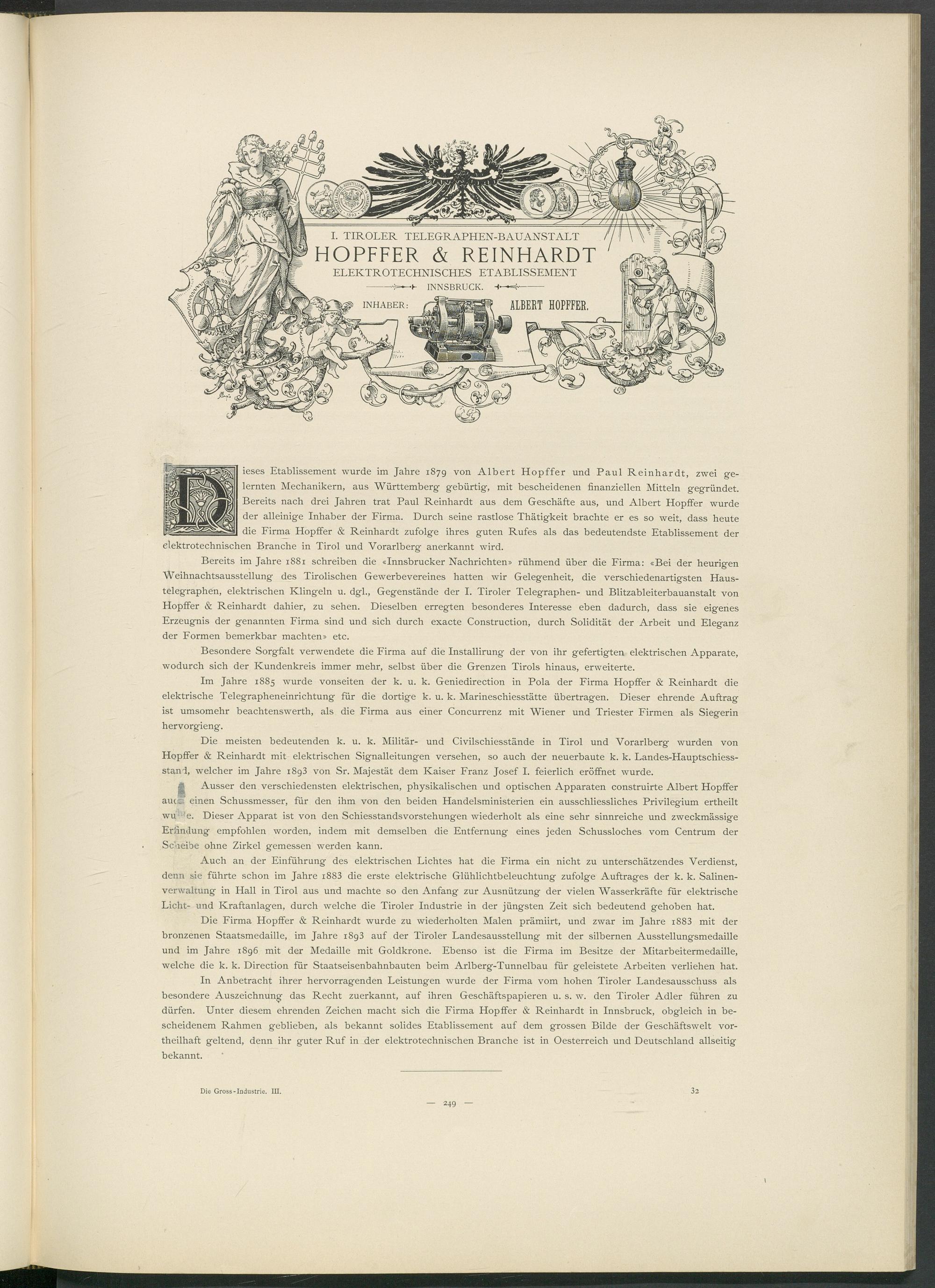 In Anbetracht ihrer hervorragenden Leistungen wurde der Firma vom hohen Tiroler Landesausschuss als besondere Auszeichnung das Recht zuerkannt, auf ihren Geschäftspapieren u. s. w. den Tiroler Adler führen zu dürfen. Unter diesem ehrenden Zeichen macht sich die Firma Hopffer & Reinhardt in Innsbruck, obgleich in bescheidenem Rahmen geblieben, als bekannt solides Etablissement auf dem grossen Bilde der Geschäftswelt vor- theilhaft geltend, denn ihr guter Ruf in der elektrotechnischen Branche ist in Oesterreich und Deutschland allseitig bekannt.