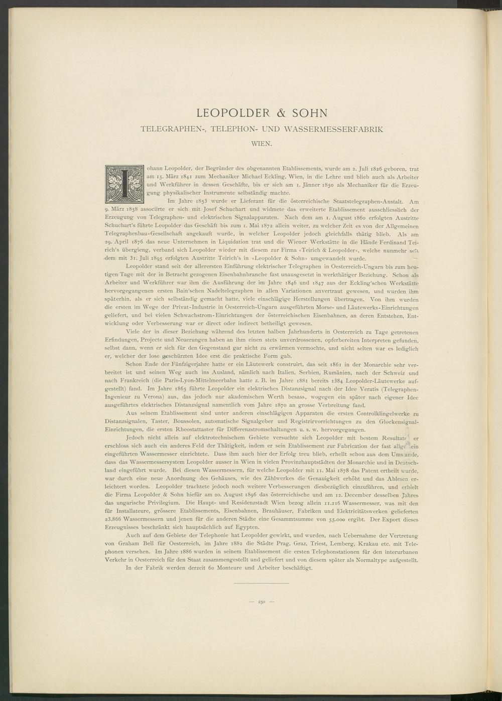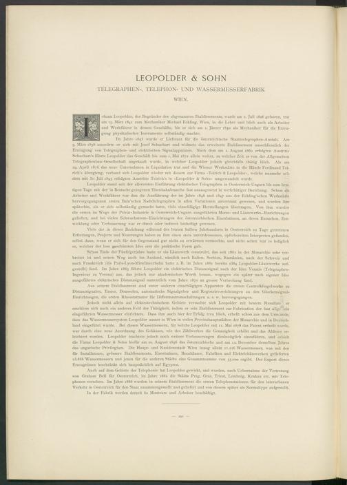 erschloss sich auch ein anderes Feld der Thätigkeit, indem er sein Etablissement zur Fabrication der fast allgemein eingeführten Wassermesser einrichtete. Dass ihm auch hier der Erfolg treu blieb, erhellt schon aus dem Ums;aride, dass das Wassermessersystem Leopolder ausser in Wien in vielen Provinzhauptstädten der Monarchie und in Deutschland eingeführt wurde. Bei diesen Wassermessern, für welche Leopolder mit 11. Mai 1878 das Patent ertheilt -wurde, war durch eine neue Anordnung des Gehäuses, wie des Zählwerkes die Genauigkeit erhöht und das Ablesen erleichtert worden. Leopolder trachtete jedoch noch weitere Verbesserungen diesbezüglich einzuführen, und erhielt die Firma Leopolder & Sohn hiefür am 20. August 1896 das österreichische und am 12. December desselben Jahres das ungarische Privilegium. Die Haupt- und Residenzstadt Wien bezog allein 11.216 Wassermesser, was mit den für Installateure, grössere Etablissements, Eisenbahnen, Brauhäuser, Fabriken und Elektricitätswerken gelieferten 23.866 Wassermessern und jenen für die anderen Städte eine Gesammtsumme von 55.000 ergibt. Der Export dieses Erzeugnisses beschränkt sich hauptsächlich auf Egypten.