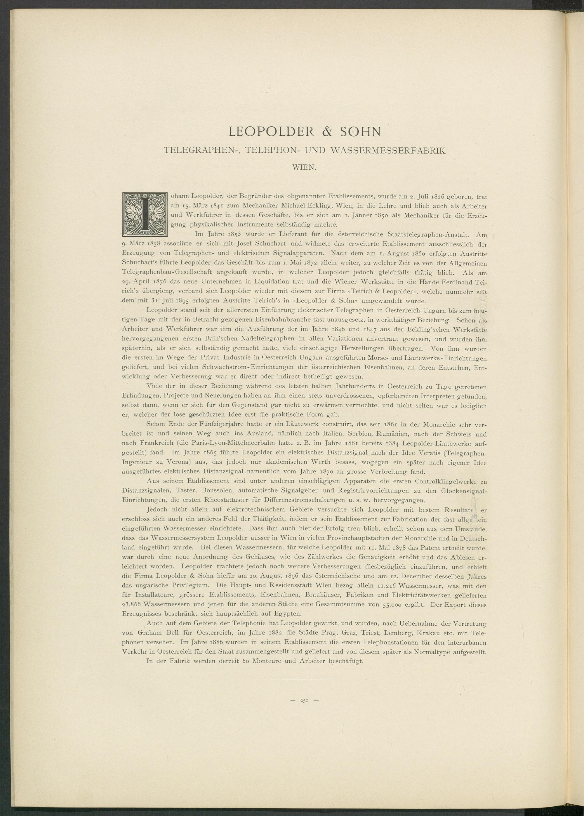 ohann Leopolder, der Begründer des obgenannten Etablissements, wurde am 2. Juli 1826 geboren, trat am 15. März 1841 zum Mechaniker Michael Eckling, Wien, in die Lehre und blieb auch als Arbeiter und Werkführer in dessen Geschäfte, bis er sich am 1. Jänner 1850 als Mechaniker für die Erzeugung physikalischer Instrumente selbständig machte.