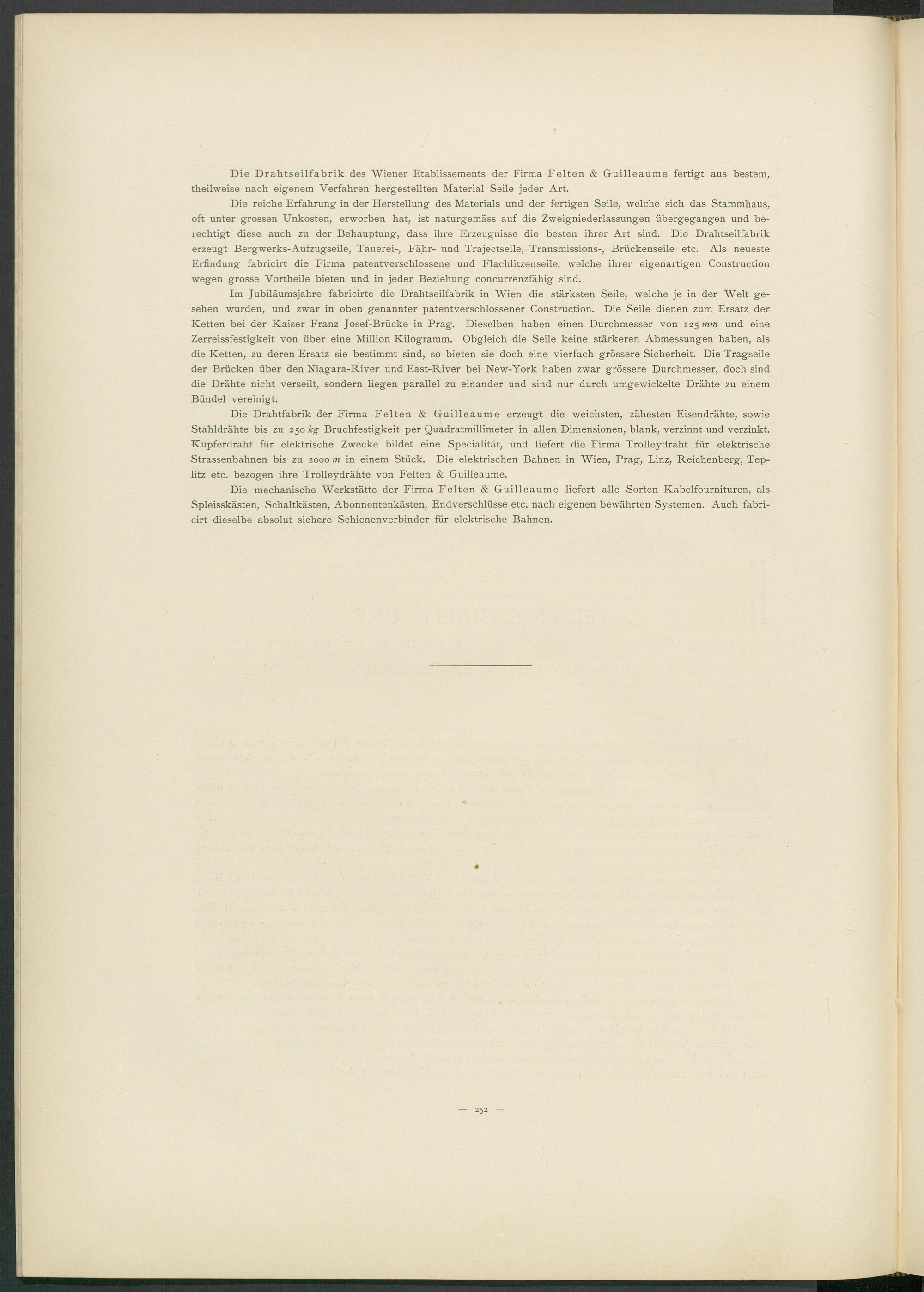 Die Drahtfabrik der Firma Felten & Guilleaume erzeugt die weichsten, zähesten Eisendrähte, sowie Stahldrähte bis zu 250 kg Bruchfestigkeit per Quadratmillimeter in allen Dimensionen, blank, verzinnt und verzinkt. Kupferdraht für elektrische Zwecke bildet eine Specialität, und liefert die Firma Trolleydraht für elektrische Strassenbahnen bis zu 2000 m in einem Stück. Die elektrischen Bahnen in Wien, Prag, Linz, Reichenberg, Tep- litz etc. bezogen ihre Trolleydrähte von Felten & Guilleaume.