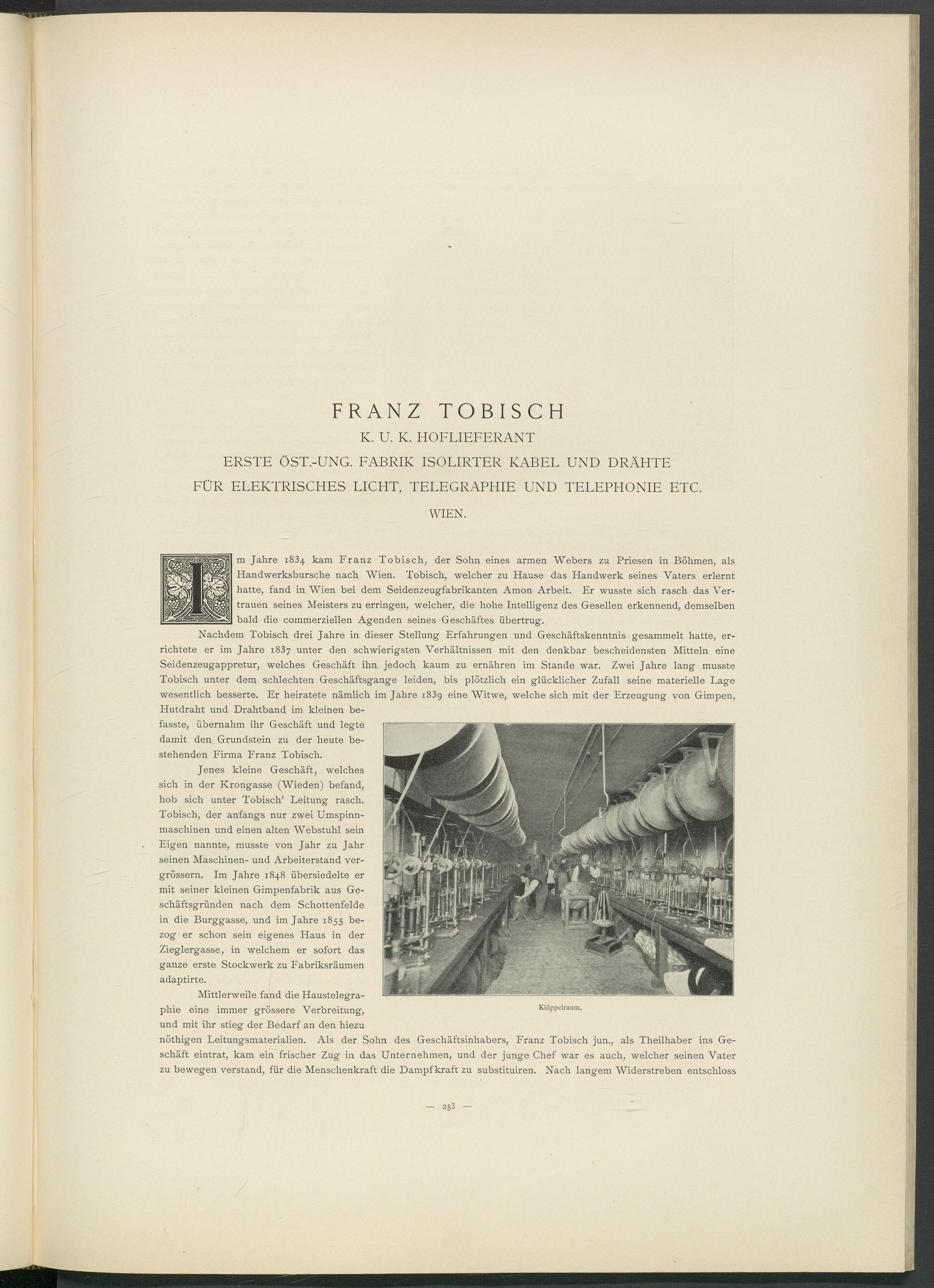 Tobisch, der anfangs nur zwei Umspinnmaschinen und einen alten Webstuhl sein Eigen nannte, musste von Jahr zu Jahr seinen Maschinen- und Arbeiterstand ver- grössern. Im Jahre 1848 übersiedelte er mit seiner kleinen Gimpenfabrik aus Geschäftsgründen nach dem Schottenfelde in die Burggasse, und im Jahre 1855 bezog er schon sein eigenes Haus in der Zieglergasse, in welchem er sofort das ganze erste Stockwerk zu Fabriksräumen adaptirte.