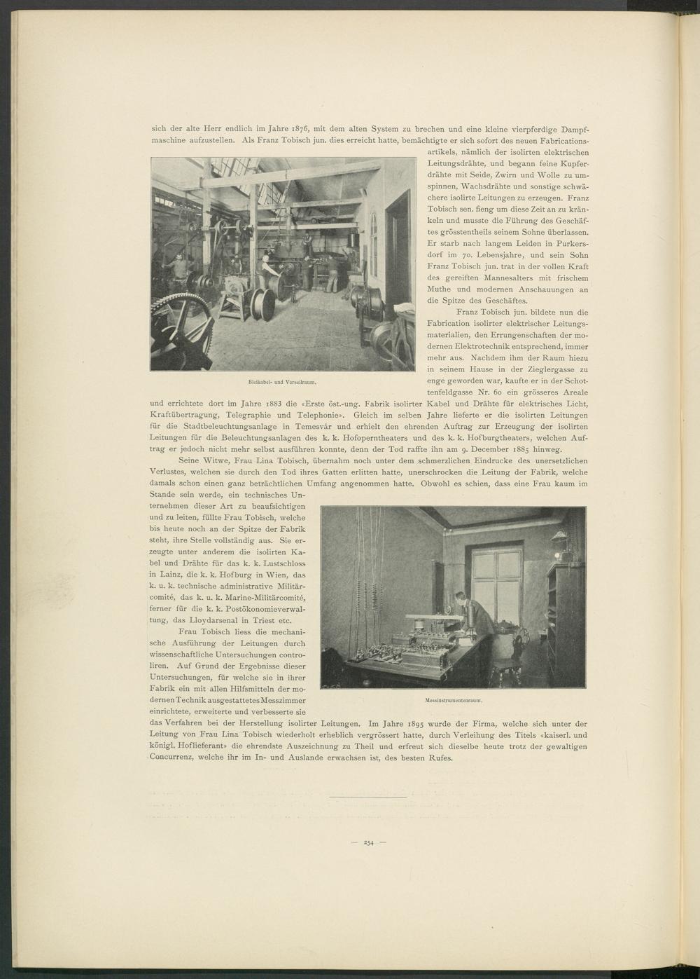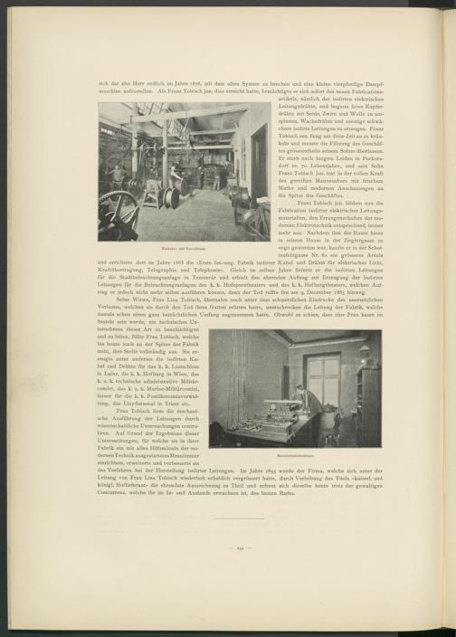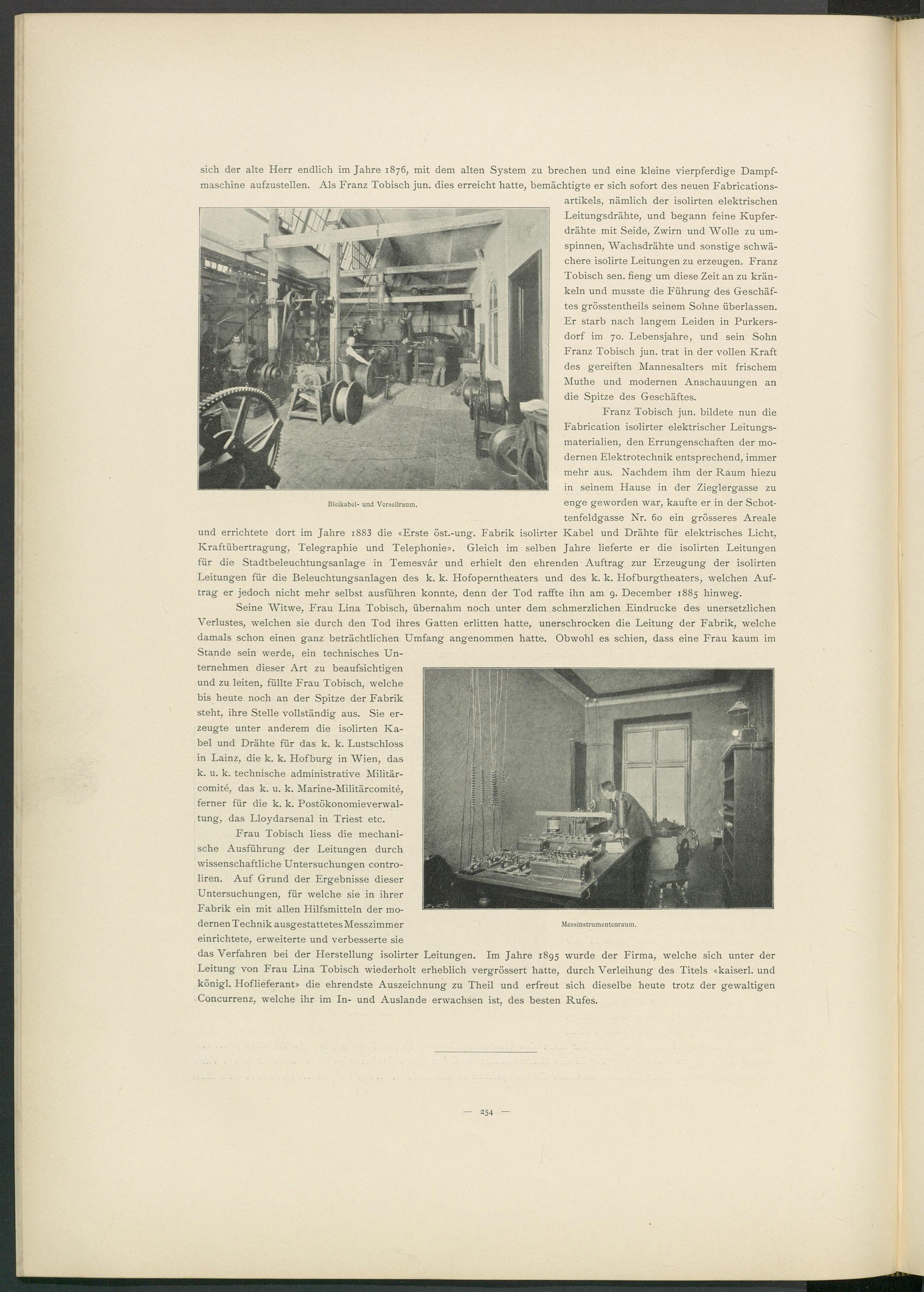 das Verfahren bei der Herstellung isolirter Leitungen. Im Jahre 1895 wurde der Firma, welche sich unter der Leitung von Frau Lina Tobisch wiederholt erheblich vergrössert hatte, durch Verleihung des Titels «kaiserl. und königl. Hoflieferant» die ehrendste Auszeichnung zu Theil und erfreut sich dieselbe heute trotz der gewaltigen Concurrenz, welche ihr im In- und Auslande erwachsen ist, des besten Rufes.
