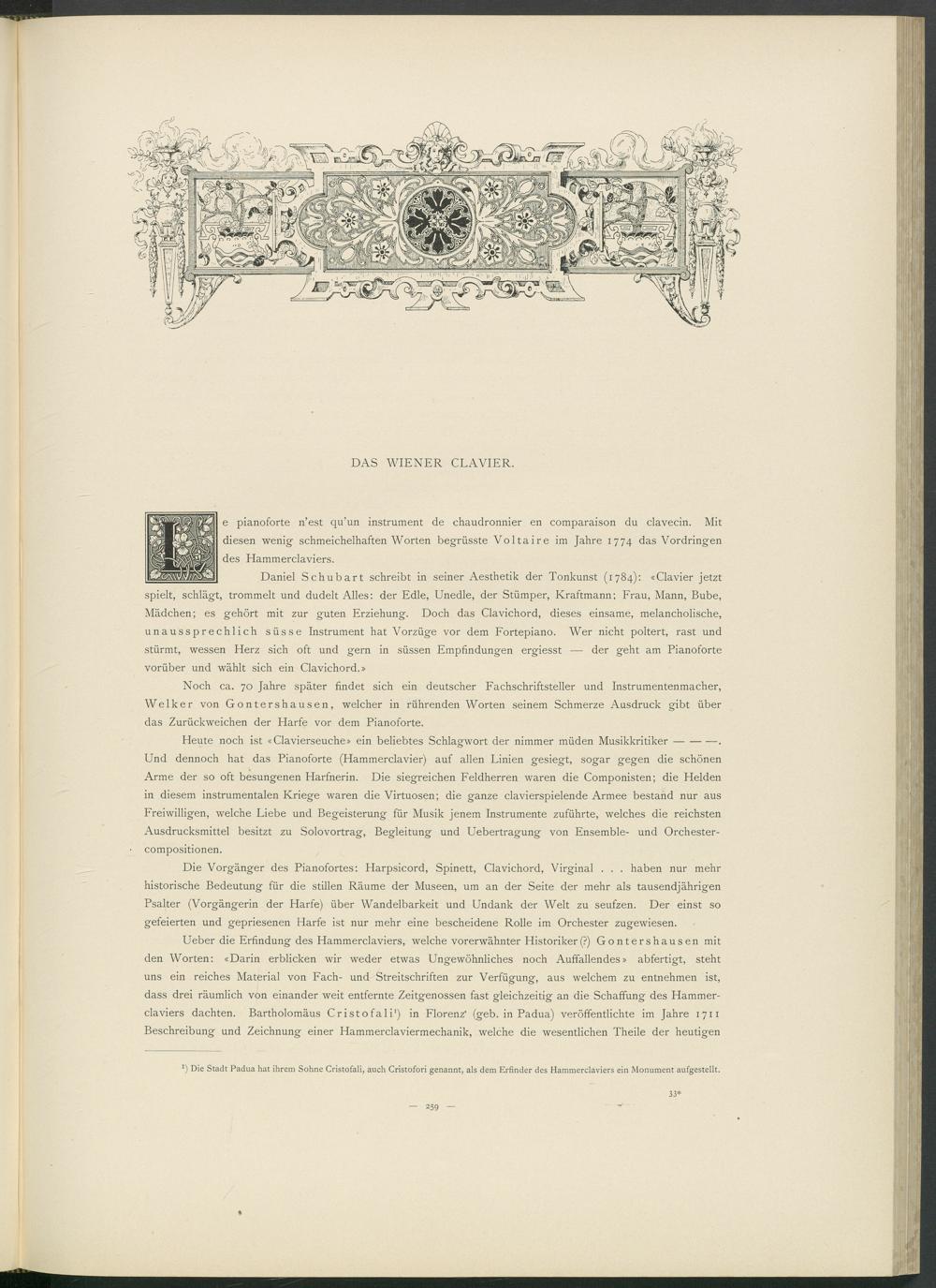 Ueber die Erfindung des Hammerclaviers, welche vorerwähnter Historiker (?) Gontershausen mit den Worten: «Darin erblicken wir weder etwas Ungewöhnliches noch Auffallendes» abfertigt, steht uns ein reiches Material von Fach- und Streitschriften zur Verfügung, aus welchem zu entnehmen ist, dass drei räumlich von einander weit entfernte Zeitgenossen fast gleichzeitig an die Schaffung des Hammer­claviers dachten. Bartholomäus Cristofali 1 ) in Florenz' (geb. in Padua) veröffentlichte im Jahre 1711 Beschreibung und Zeichnung einer Hammerclaviermechanik, welche die wesentlichen Theile der heutigen