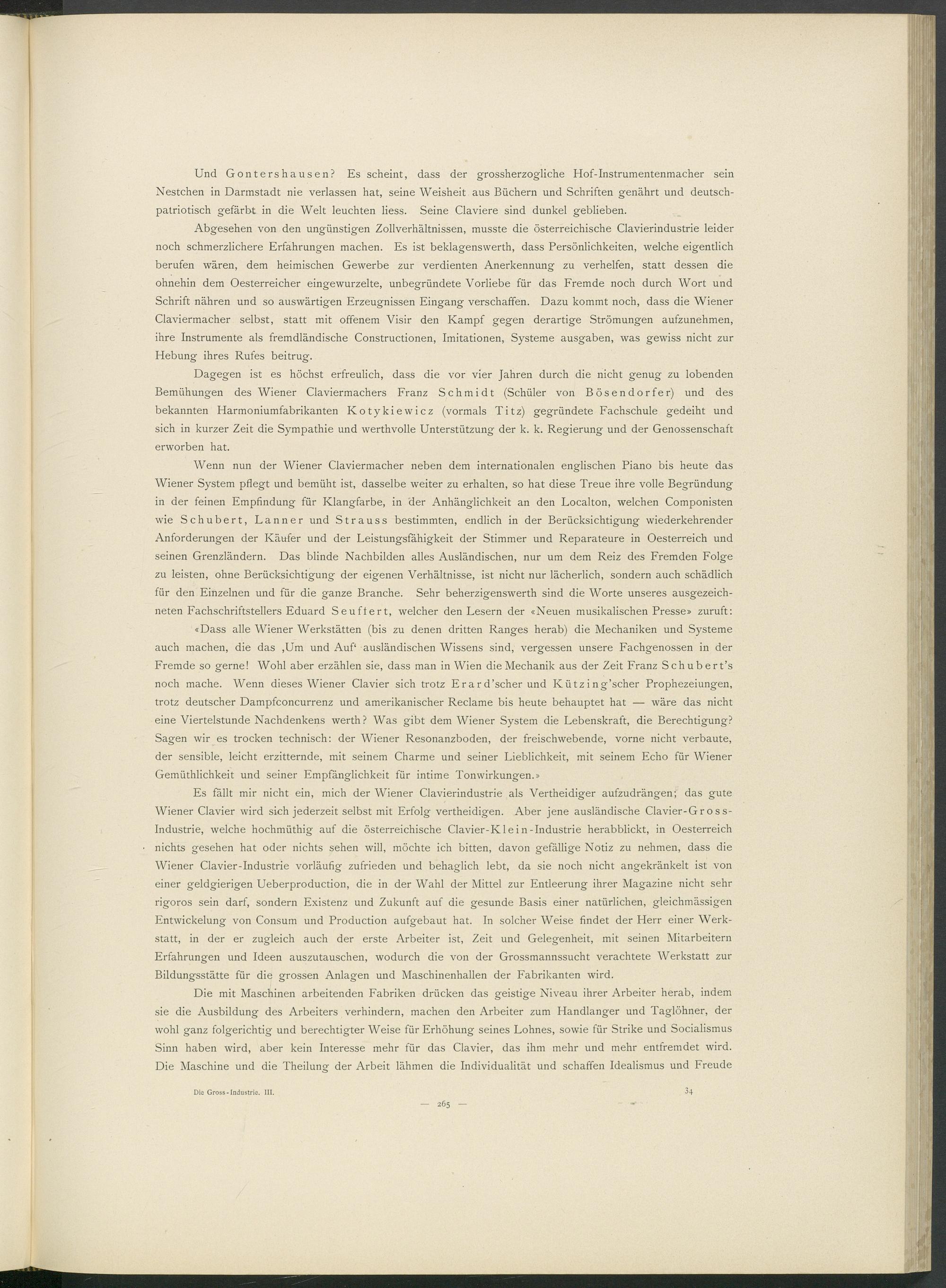 Es fällt mir nicht ein, mich der Wiener Clavierindustrie als Vertheidiger aufzudrängen; das gute Wiener Clavier wird sich jederzeit selbst mit Erfolg vertheidigen. Aber jene ausländische Clavier-Gross- Industrie, welche hochmüthig auf die österreichische Clavier-Kle in-Industrie herabblickt, in Oesterreich nichts gesehen hat oder nichts sehen will, möchte ich bitten, davon gefällige Notiz zu nehmen, dass die Wiener Clavier-Industrie vorläufig zufrieden und behaglich lebt, da sie noch nicht angekränkelt ist von einer geldgierigen Ueberproduction, die in der Wahl der Mittel zur Entleerung ihrer Magazine nicht sehr rigoros sein darf, sondern Existenz und Zukunft auf die gesunde Basis einer natürlichen, gleichmässigen Entwickelung von Consum und Production aufgebaut hat. In solcher Weise findet der Herr einer Werkstatt, in der er zugleich auch der erste Arbeiter ist, Zeit und Gelegenheit, mit seinen Mitarbeitern Erfahrungen und Ideen auszutauschen, wodurch die von der Grossmannssucht verachtete Werkstatt zur Bildungsstätte für die grossen Anlagen und Maschinenhallen der Fabrikanten wird.