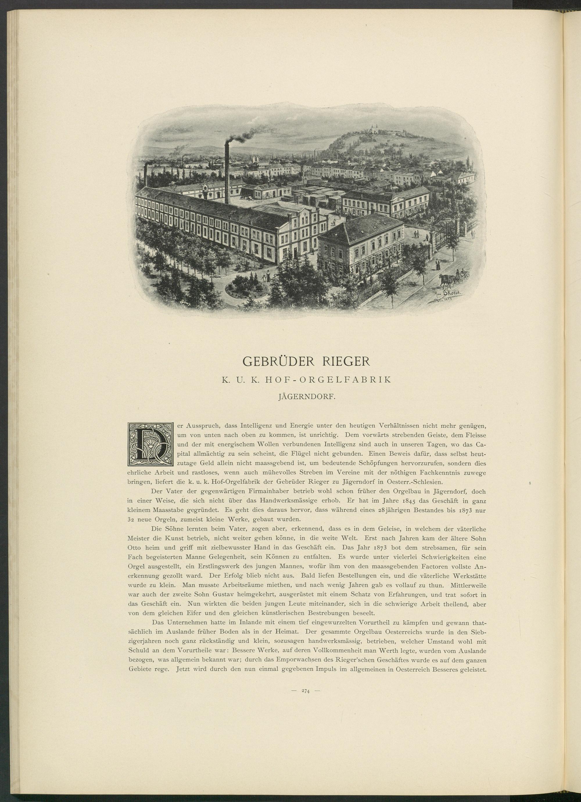 er Ausspruch, dass Intelligenz und Energie unter den heutigen Verhältnissen nicht mehr genügen, um von unten nach oben zu kommen, ist unrichtig. Dem vorwärts strebenden Geiste, dem Fleisse und der mit energischem Wollen verbundenen Intelligenz sind auch in unseren Tagen, wo das Capital allmächtig zu sein scheint, die Flügel nicht gebunden. Einen Beweis dafür, dass selbst heutzutage Geld allein nicht maassgebend ist, um bedeutende Schöpfungen hervorzurufen, sondern dies ehrliche Arbeit und rastloses, wenn auch mühevolles Streben im Vereine mit der nöthigen Fachkenntnis zuwege bringen, liefert die k. u. k. Hof-Orgelfabrik der Gebrüder Rieger zu Jägerndorf in Oesterr.-Schlesien.