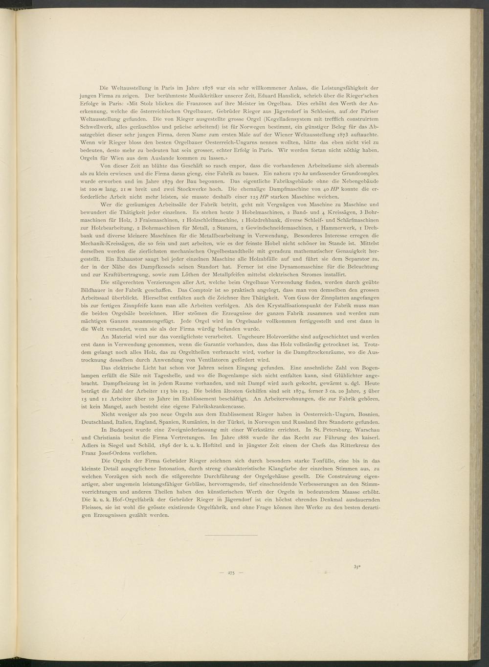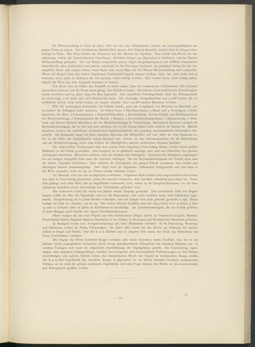 Die Orgeln der Firma Gebrüder Rieger zeichnen sich durch besonders starke Tonfülle, eine bis in das kleinste Detail ausgeglichene Intonation, durch streng charakteristische Klangfarbe der einzelnen Stimmen aus, zu welchen Vorzügen sich noch die stilgerechte Durchführung der Orgelgehäuse gesellt. Die Construirung eigen­artiger, aber ungemein leistungsfähiger Gebläse, hervorragende, tief einschneidende Verbesserungen an den Stimm­vorrichtungen und anderen Theilen haben den künstlerischen Werth der Orgeln in bedeutendem Maasse erhöht. Die k. u. k. Hof-Orgelfabrik der Gebrüder Rieger in Jägerndorf ist ein höchst ehrendes Denkmal ausdauernden Fleisses, sie ist wohl die grösste existirende Orgelfabrik, und ohne Frage können ihre Werke zu den besten derarti­gen Erzeugnissen gezählt werden.