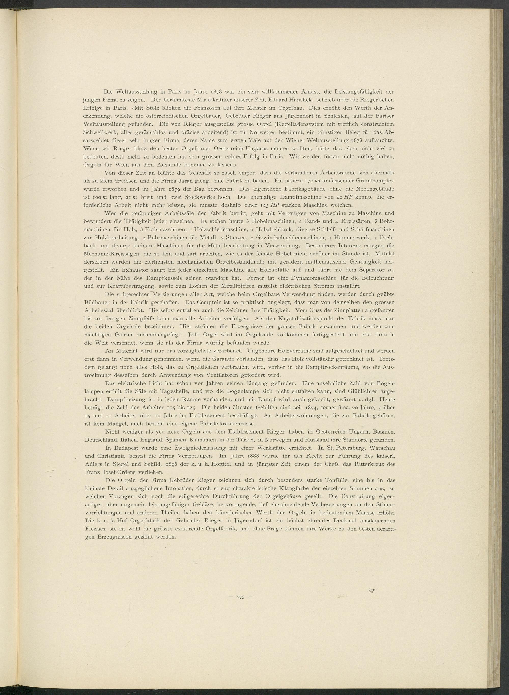 Die Weltausstellung in Paris im Jahre 1878 war ein sehr willkommener Anlass, die Leistungsfähigkeit der jungen Firma zu zeigen. Der berühmteste Musikkritiker unserer Zeit, Eduard Hanslick, schrieb über die Riegerschen Erfolge in Paris: «Mit Stolz blicken die Franzosen auf ihre Meister im Orgelbau. Dies erhöht den Werth der An­erkennung, welche die österreichischen Orgelbauer, Gebrüder Rieger aus Jägerndorf in Schlesien, auf der Pariser Weltausstellung gefunden. Die von Rieger ausgestellte grosse Orgel (Kegelladensystem mit trefflich construirtem Schwellwerk, alles geräuschlos und präcise arbeitend) ist für Norwegen bestimmt, ein günstiger Beleg für das Ab­satzgebiet dieser sehr jungen Firma, deren Name zum ersten Male auf der Wiener Weltausstellung 1873 auftauchte. Wenn wir Rieger bloss den besten Orgelbauer Oesterreich-Ungarns nennen wollten, hätte das eben nicht viel zu bedeuten, desto mehr zu bedeuten hat sein grosser, echter Erfolg in Paris. Wir werden fortan nicht nöthig haben, Orgeln für Wien aus dem Auslande kommen zu lassen.»