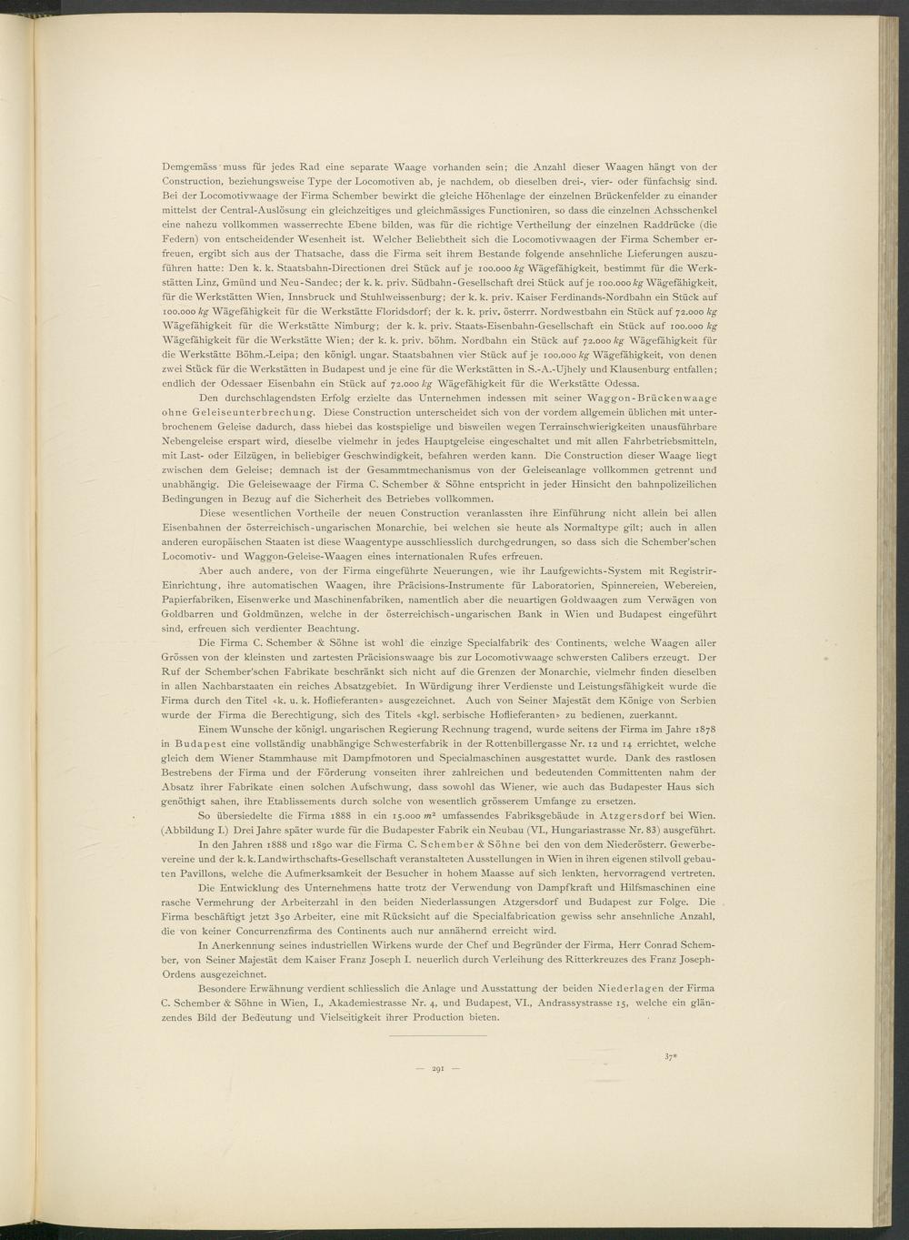 Die Firma C. Schember & Söhne ist wohl die einzige Specialfabrik des' Continents, welche Waagen aller Grössen von der kleinsten und zartesten Präcisionswaage bis zur Locomotivwaage schwersten Calibers erzeugt. Der Ruf der Schember’schen Fabrikate beschränkt sich nicht auf die Grenzen der Monarchie, vielmehr finden dieselben in allen Nachbarstaaten ein reiches Absatzgebiet. In Würdigung ihrer Verdienste und Leistungsfähigkeit wurde die Firma durch den Titel «k. u. k. Hoflieferanten» ausgezeichnet. Auch von Seiner Majestät dem Könige von Serbien wurde der Firma die Berechtigung, sich des Titels «kgl. serbische Hoflieferanten» zu bedienen, zuerkannt.