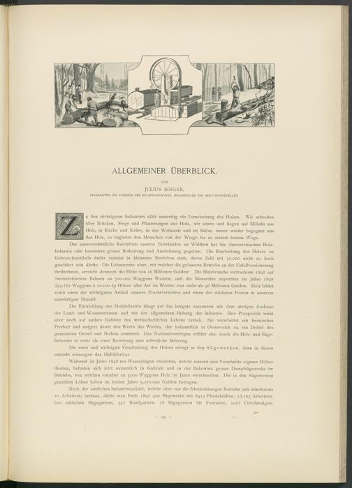 Die Entwicklung der Holzindustrie hängt auf das innigste zusammen mit dem stetigen Ausbaue der Land- und Wasserstrassen und mit der allgemeinen Hebung der Industrie. Ihre Prosperität wirkt aber noch auf andere Gebiete des wirthschaftlichen Lebens zurück. Sie verarbeitet ein heimisches Product und steigert damit den Werth des Waldes, der bekanntlich in Oesterreich ca. ein Drittel des gesammten Grund und Bodens einnimmt. Das Nationalvermögen erfährt also durch die Holz- und Säge- Industrie in mehr als einer Beziehung eine erfreuliche Mehrung.