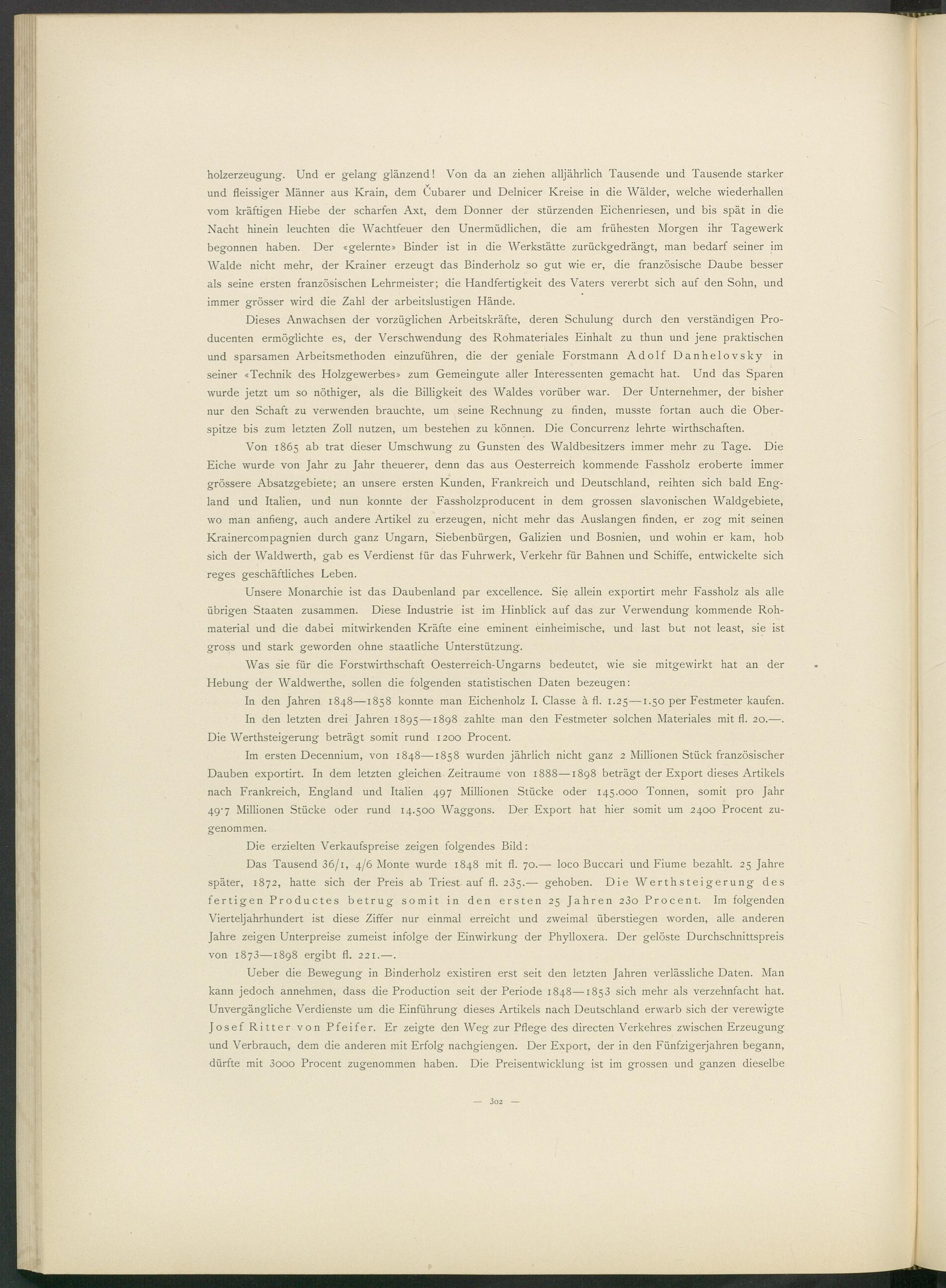 Ueber die Bewegung in Binderholz existiren erst seit den letzten Jahren verlässliche Daten. Man kann jedoch annehmen, dass die Production seit der Periode 1848—1853 sich mehr als verzehnfacht hat. Unvergängliche Verdienste um die Einführung dieses Artikels nach Deutschland erwarb sich der verewigte Josef Ritter von Pfeifer. Er zeigte den Weg zur Pflege des directen Verkehres zwischen Erzeugung und Verbrauch, dem die anderen mit Erfolg nachgiengen. Der Export, der in den Fünfzigerjahren begann, dürfte mit 3 ooo Procent zugenommen haben. Die Preisentwicklung ist im grossen und ganzen dieselbe