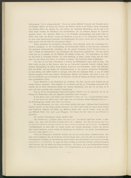 Von 1865 ab trat dieser Umschwung zu Gunsten des Waldbesitzers immer mehr zu Tage. Die Eiche wurde von Jahr zu Jahr theuerer, denn das aus Oesterreich kommende Fassholz eroberte immer grössere Absatzgebiete; an unsere ersten Kunden, Frankreich und Deutschland, reihten sich bald England und Italien, und nun konnte der Fassholzproducent in dem grossen slavonischen Waldgebiete, wo man anfieng, auch andere Artikel zu erzeugen, nicht mehr das Auslangen finden, er zog mit seinen Krainercompagnien durch ganz Ungarn, Siebenbürgen, Galizien und Bosnien, und wohin er kam, hob sich der Waldwerth, gab es Verdienst für das Fuhrwerk, Verkehr für Bahnen und Schiffe, entwickelte sich reges geschäftliches Leben.