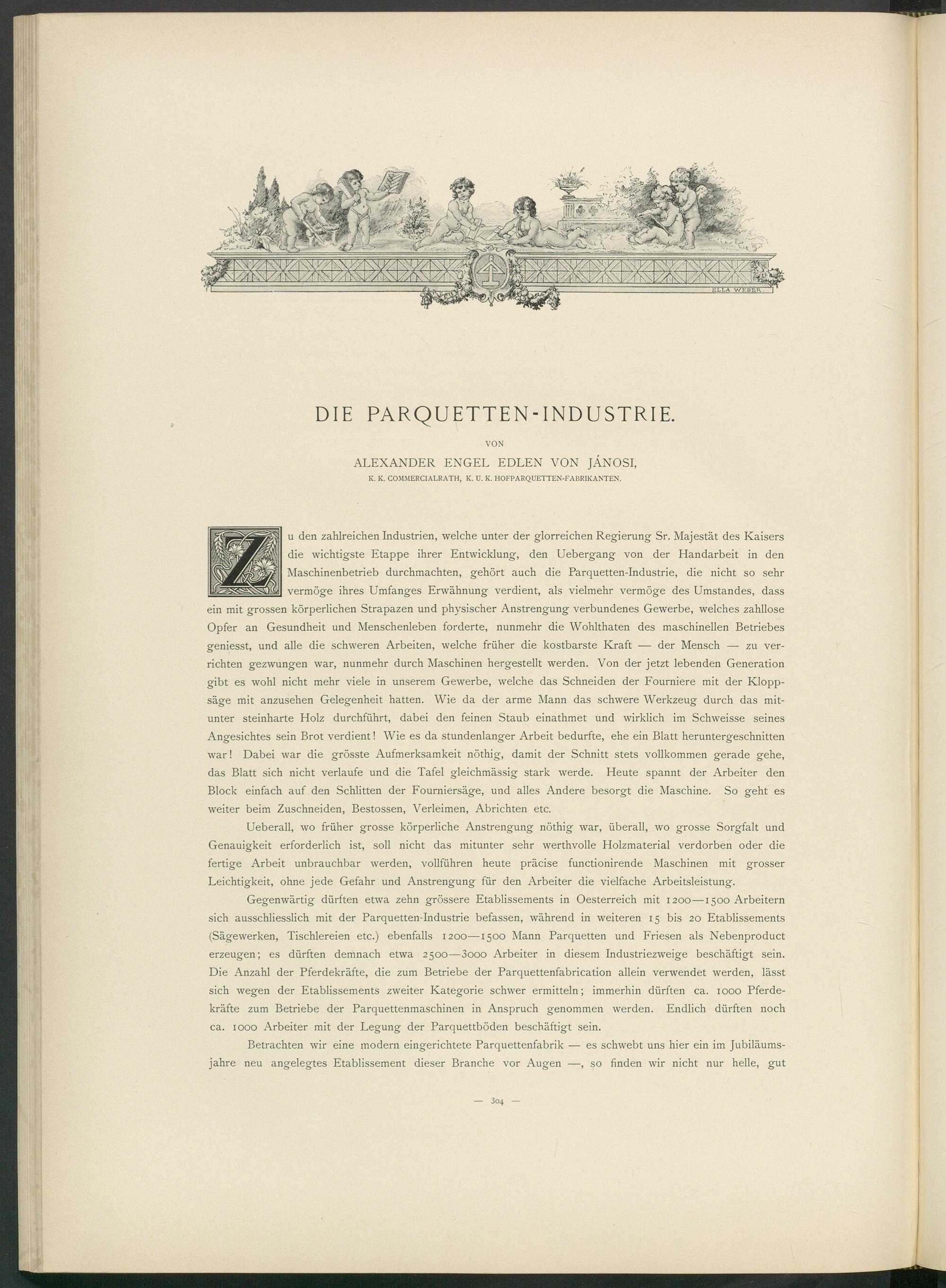 u den zahlreichen Industrien, welche unter der glorreichen Regierung Sr. Majestät des Kaisers die wichtigste Etappe ihrer Entwicklung, den Uebergang von der Handarbeit in den Maschinenbetrieb durchmachten, gehört auch die Parquetten-Industrie, die nicht so sehr vermöge ihres Umfanges Erwähnung verdient, als vielmehr vermöge des Umstandes, dass ein mit grossen körperlichen Strapazen und physischer Anstrengung verbundenes Gewerbe, welches zahllose Opfer an Gesundheit und Menschenleben forderte, nunmehr die Wohlthaten des maschinellen Betriebes geniesst, und alle die schweren Arbeiten, welche früher die kostbarste Kraft — der Mensch — zu verrichten gezwungen war, nunmehr durch Maschinen hergestellt werden. Von der jetzt lebenden Generation gibt es wohl nicht mehr viele in unserem Gewerbe, welche das Schneiden der Fourniere mit der Kloppsäge mit anzusehen Gelegenheit hatten. Wie da der arme Mann das schwere Werkzeug durch das mitunter steinharte Holz durchführt, dabei den feinen Staub einathmet und wirklich im Schweisse seines Angesichtes sein Brot verdient! Wie es da stundenlanger Arbeit bedurfte, ehe ein Blatt heruntergeschnitten war! Dabei war die grösste Aufmerksamkeit nöthig, damit der Schnitt stets vollkommen gerade gehe, das Blatt sich nicht verlaufe und die Tafel gleichmässig stark werde. Heute spannt der Arbeiter den Block einfach auf den Schlitten der Fourniersäge, und alles Andere besorgt die Maschine. So geht es weiter beim Zuschneiden, Bestossen, Verleimen, Abrichten etc.