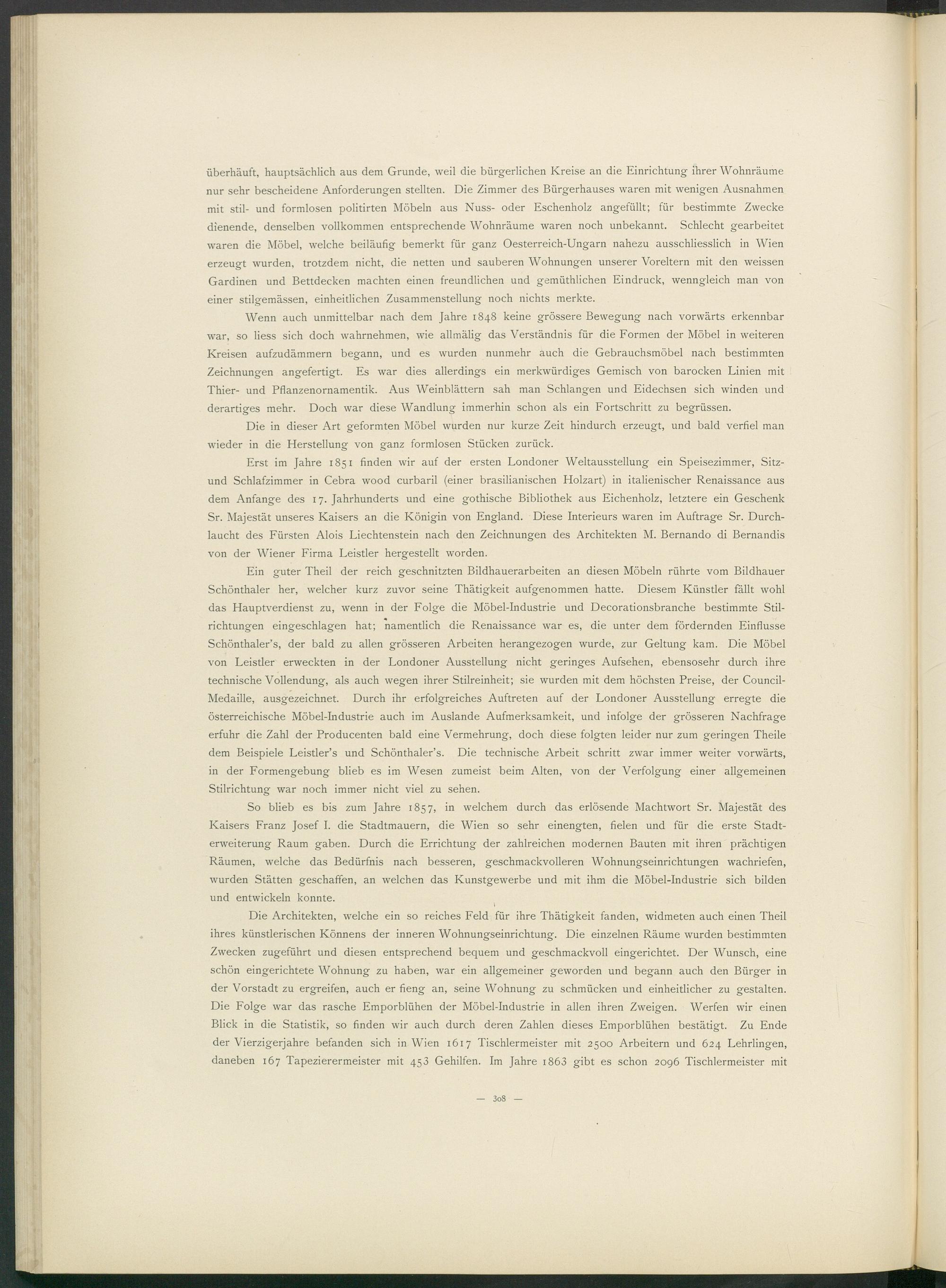 Erst im Jahre 1851 finden wir auf der ersten Londoner Weltausstellung ein Speisezimmer, Sitz- und Schlafzimmer in Cebra wood curbaril (einer brasilianischen Holzart) in italienischer Renaissance aus dem Anfänge des 17. Jahrhunderts und eine gothische Bibliothek aus Eichenholz, letztere ein Geschenk Sr. Majestät unseres Kaisers an die Königin von England. Diese Interieurs waren im Aufträge Sr. Durchlaucht des Fürsten Alois Liechtenstein nach den Zeichnungen des Architekten M. Bernando di Bernandis von der Wiener Firma Leistier hergestellt worden.