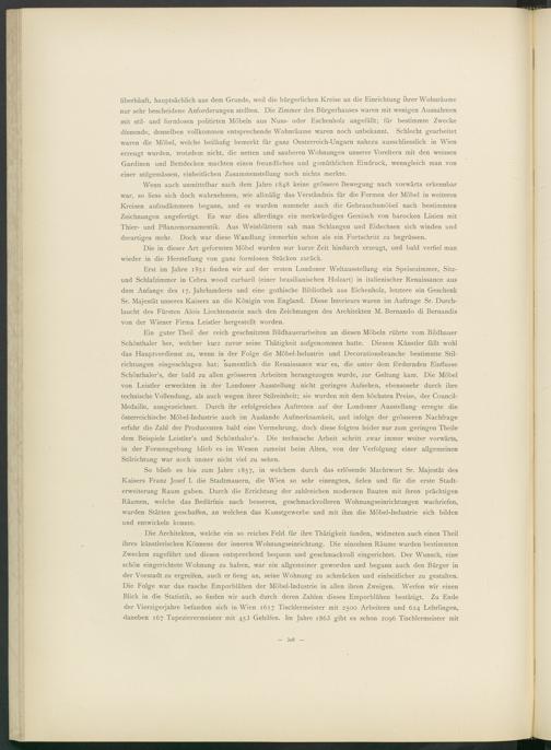 richtungen eingeschlagen hat; namentlich die Renaissance war es, die unter dem fördernden Einflüsse Schönthaler’s, der bald zu allen grösseren Arbeiten herangezogen wurde, zur Geltung kam. Die Möbel von Leistier erweckten in der Londoner Ausstellung nicht geringes Aufsehen, ebensosehr durch ihre technische Vollendung, als auch wegen ihrer Stilreinheit; sie wurden mit dem höchsten Preise, der Council- Medaille, ausgezeichnet. Durch ihr erfolgreiches Auftreten auf der Londoner Ausstellung erregte die österreichische Möbel-Industrie auch im Auslande Aufmerksamkeit, und infolge der grösseren Nachfrage erfuhr die Zahl der Producenten bald eine Vermehrung, doch diese folgten leider nur zum geringen Theile dem Beispiele Leistler’s und Schönthaler’s. Die technische Arbeit schritt zwar immer weiter vorwärts, in der Formengebung blieb es im Wesen zumeist beim Alten, von der Verfolgung einer allgemeinen Stilrichtung war noch immer nicht viel zu sehen.
