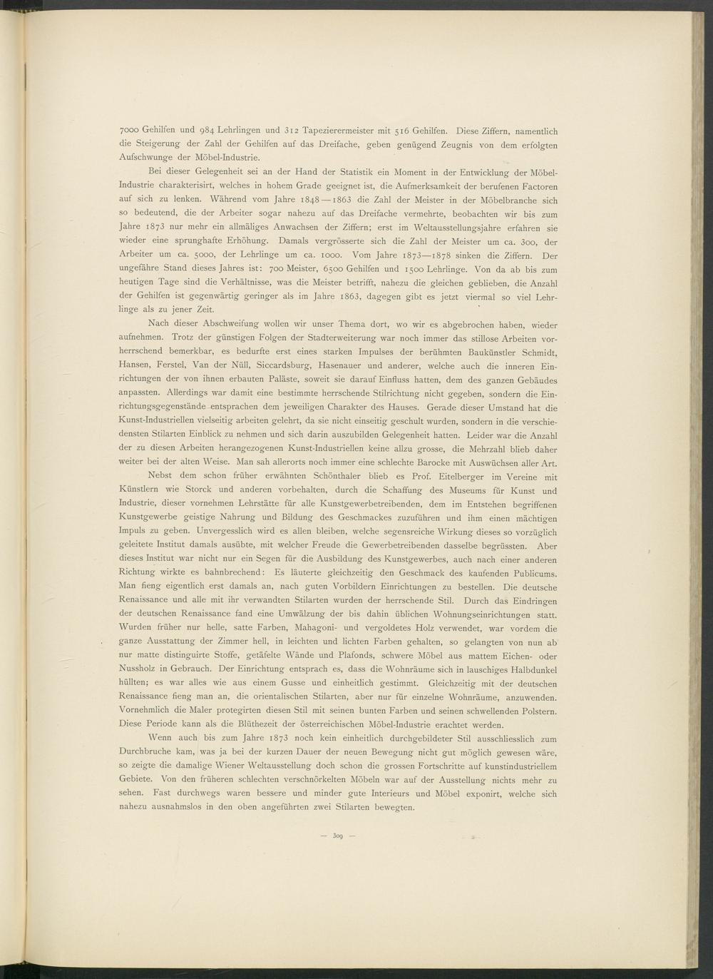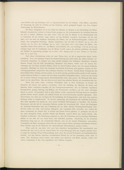 Nebst dem schon früher erwähnten Schönthaler blieb es Prof. Eitelberger im Vereine mit Künstlern wie Storck und anderen Vorbehalten, durch die Schaffung des Museums für Kunst und Industrie, dieser vornehmen Lehrstätte für alle Kunstgewerbetreibenden, dem im Entstehen begriffenen Kunstgewerbe geistige Nahrung und Bildung des Geschmackes zuzuführen und ihm einen mächtigen Impuls zu geben. Unvergesslich wird es allen bleiben, welche segensreiche Wirkung dieses so vorzüglich geleitete Institut damals ausübte, mit welcher Freude die Gewerbetreibenden dasselbe begrüssten. Aber dieses Institut war nicht nur ein Segen für die Ausbildung des Kunstgewerbes, auch nach einer anderen Richtung wirkte es bahnbrechend: Es läuterte gleichzeitig den Geschmack des kaufenden Publicums. Man fieng eigentlich erst damals an, nach guten Vorbildern Einrichtungen zu bestellen. Die deutsche Renaissance und alle mit ihr verwandten Stilarten wurden der herrschende Stil. Durch das Eindringen der deutschen Renaissance fand eine Umwälzung der bis dahin üblichen Wohnungseinrichtungen statt. Wurden früher nur helle, satte Farben, Mahagoni- und vergoldetes Holz verwendet, war vordem die ganze Ausstattung der Zimmer hell, in leichten und lichten Farben gehalten, so gelangten von nun ab nur matte distinguirte Stoffe, getäfelte Wände und Plafonds, schwere Möbel aus mattem Eichen- oder Nussholz in Gebrauch. Der Einrichtung entsprach es, dass die Wohnräume sich in lauschiges Halbdunkel hüllten; es war alles wie aus einem Gusse und einheitlich gestimmt. Gleichzeitig mit der deutschen Renaissance fieng man an, die orientalischen Stilarten, aber nur für einzelne Wohnräume, anzuwenden. Vornehmlich die Maler protegirten diesen Stil mit seinen bunten Farben und seinen schwellenden Polstern. Diese Periode kann als die Blüthezeit der österreichischen Möbel-Industrie erachtet werden.