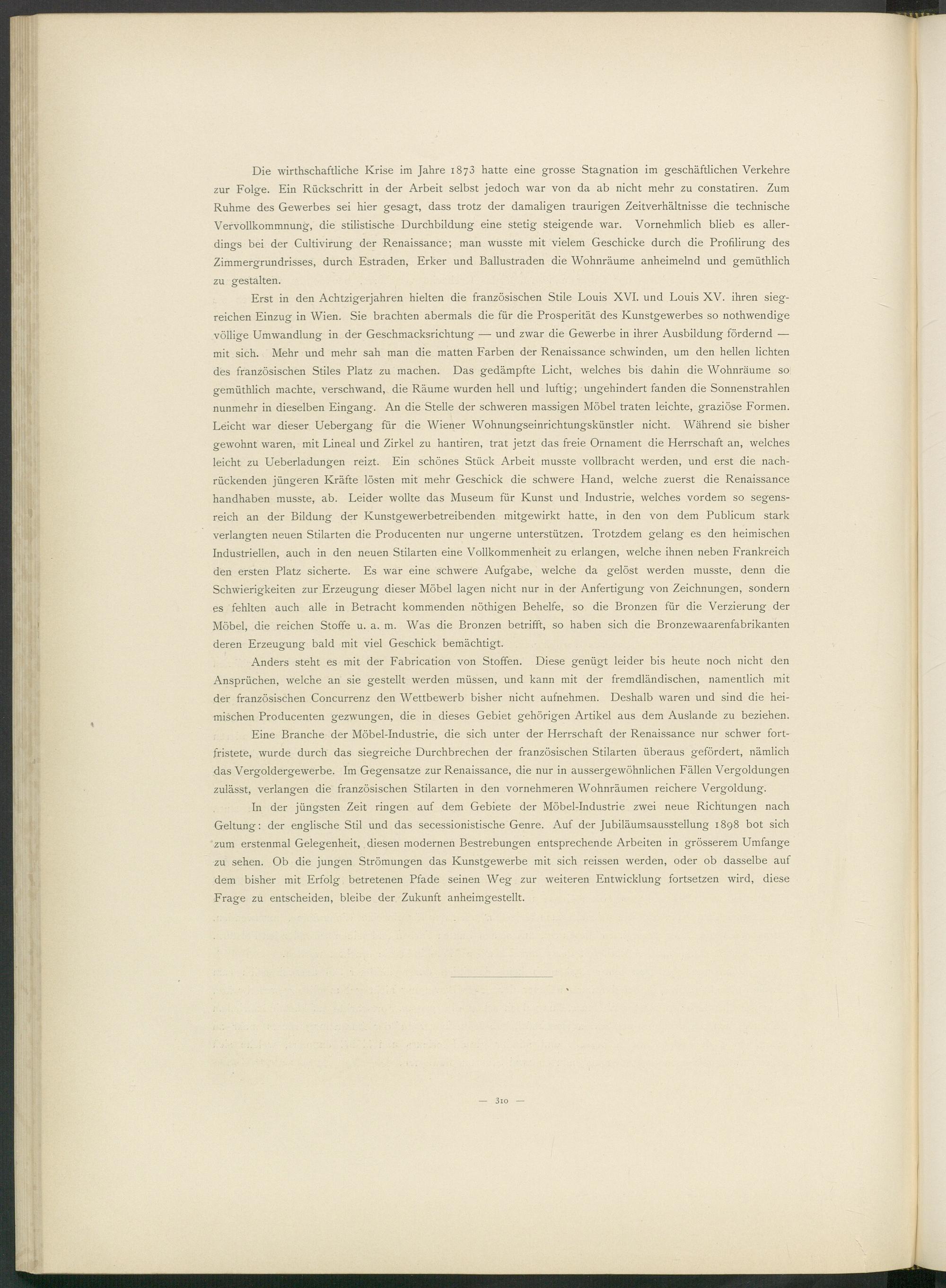 Die wirthschaftliche Krise im Jahre 1873 hatte eine grosse Stagnation im geschäftlichen Verkehre zur Folge. Ein Rückschritt in der Arbeit selbst jedoch war von da ab nicht mehr zu constatiren. Zum Ruhme des Gewerbes sei hier gesagt, dass trotz der damaligen traurigen Zeitverhältnisse die technische Vervollkommnung, die stilistische Durchbildung eine stetig steigende war. Vornehmlich blieb es allerdings bei der Cultivirung der Renaissance; man wusste mit vielem Geschicke durch die Profilirung des Zimmergrundrisses, durch Estraden, Erker und Bailustraden die Wohnräume anheimelnd und gemüthlich zu gestalten.