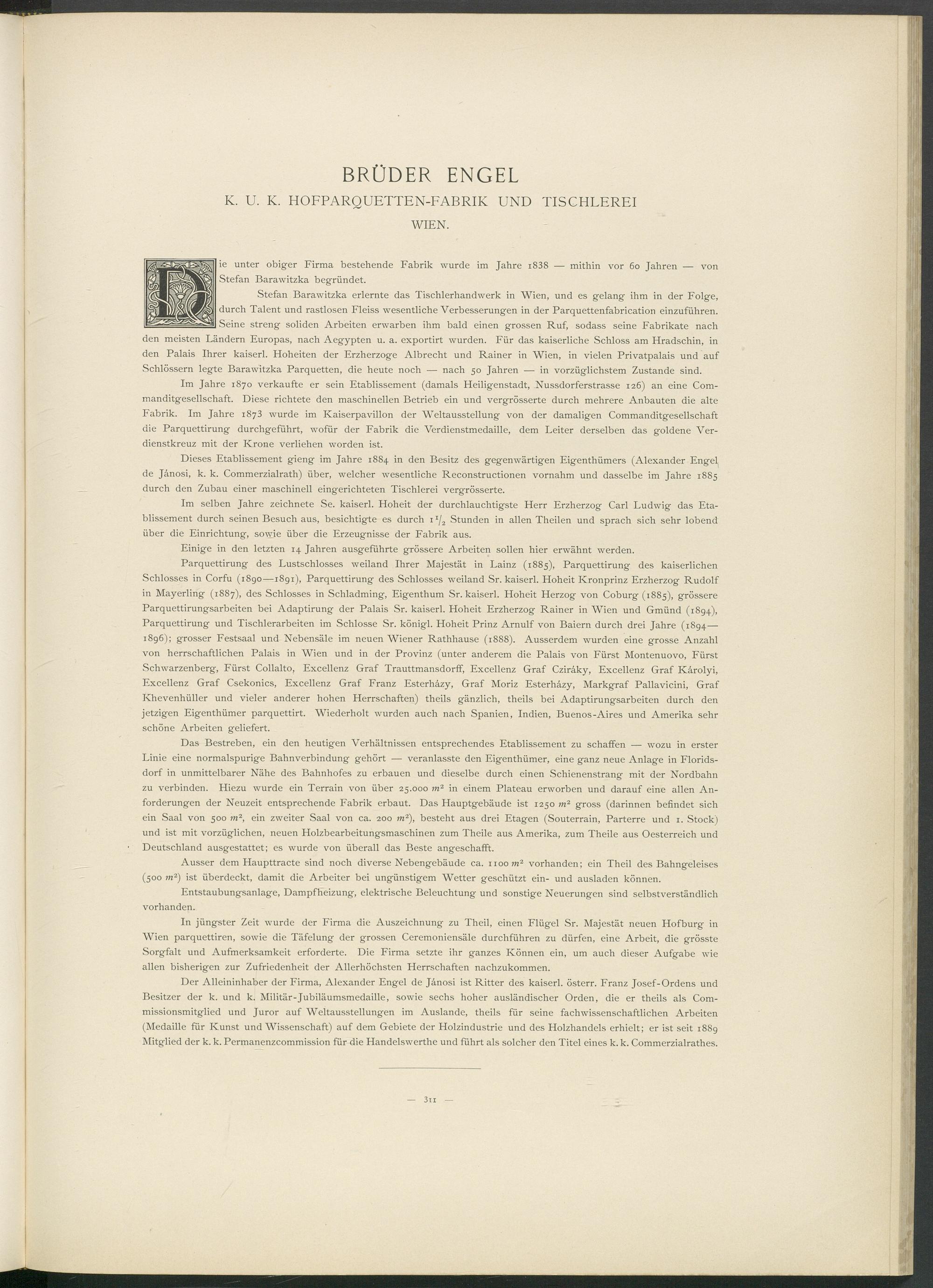 Der Alleininhaber der Firma, Alexander Engel de Jänosi ist Ritter des kaiserl. österr. Franz Josef-Ordens und Besitzer der k. und k. Militär-Jubiläumsmedaille, sowie sechs hoher ausländischer Orden, die er theils als Commissionsmitglied und Juror auf Weltausstellungen im Auslande, theils für seine fachwissenschaftlichen Arbeiten (Medaille für Kunst und Wissenschaft) auf dem Gebiete der Holzindustrie und des Holzhandels erhielt; er ist seit 1889 Mitglied der k. k. Permanenzcommission für die Handelswerthe und führt als solcher den Titel eines k. k. Commerzialrathes.