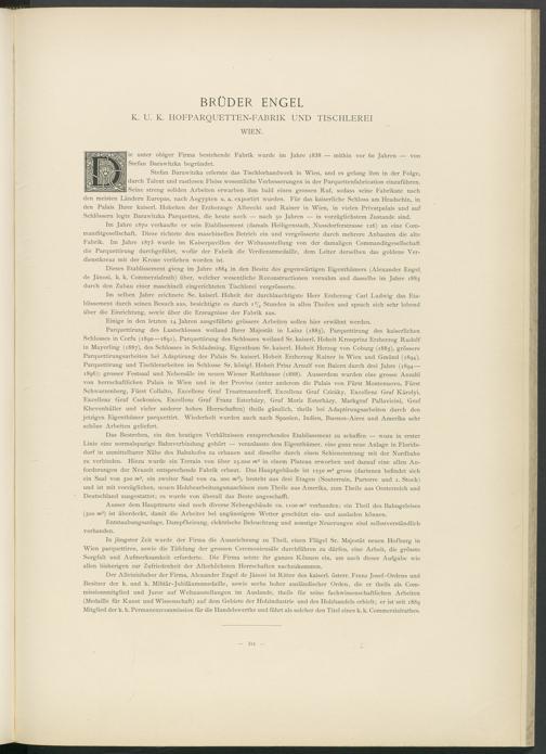 In jüngster Zeit wurde der Firma die Auszeichnung zu Theil, einen Flügel Sr. Majestät neuen Hofburg in Wien parquettiren, sowie die Täfelung der grossen Ceremoniensäle durchführen zu dürfen, eine Arbeit, die grösste Sorgfalt und Aufmerksamkeit erforderte. Die Firma setzte ihr ganzes Können ein, um auch dieser Aufgabe wie allen bisherigen zur Zufriedenheit der Allerhöchsten Herrschaften nachzukommen.