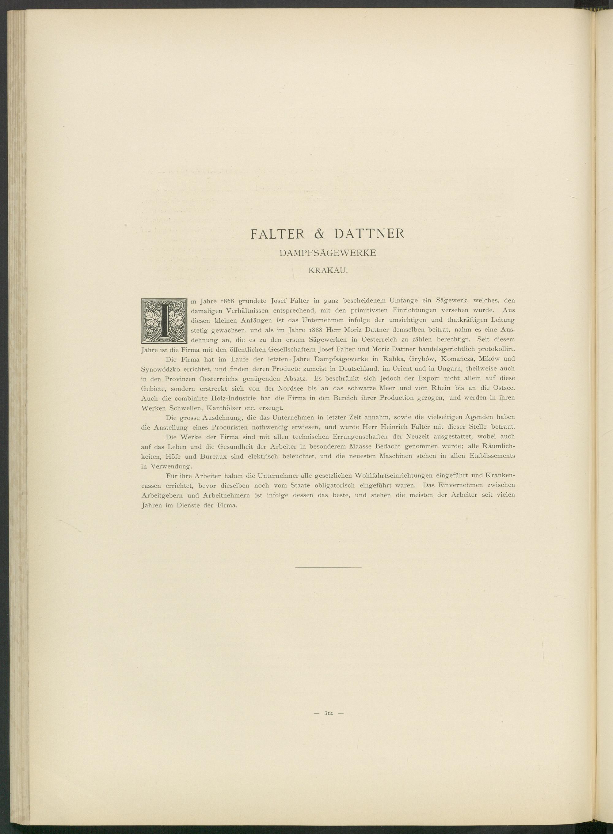 m Jahre 1868 gründete Josef Falter in ganz bescheidenem Umfange ein Sägewerk, welches, den damaligen Verhältnissen entsprechend, mit den primitivsten Einrichtungen versehen wurde. Aus diesen kleinen Anfängen ist das Unternehmen infolge der umsichtigen und thatkräftigen Leitung stetig gewachsen, und als im Jahre 1888 Herr Moriz Dattner demselben beitrat, nahm es eine Ausdehnung an, die es zu den ersten Sägewerken in Oesterreich zu zählen berechtigt. Seit diesem Jahre ist die Firma mit den öffentlichen Gesellschaftern Josef Falter und Moriz Dattner handelsgerichtlich protokollirt.