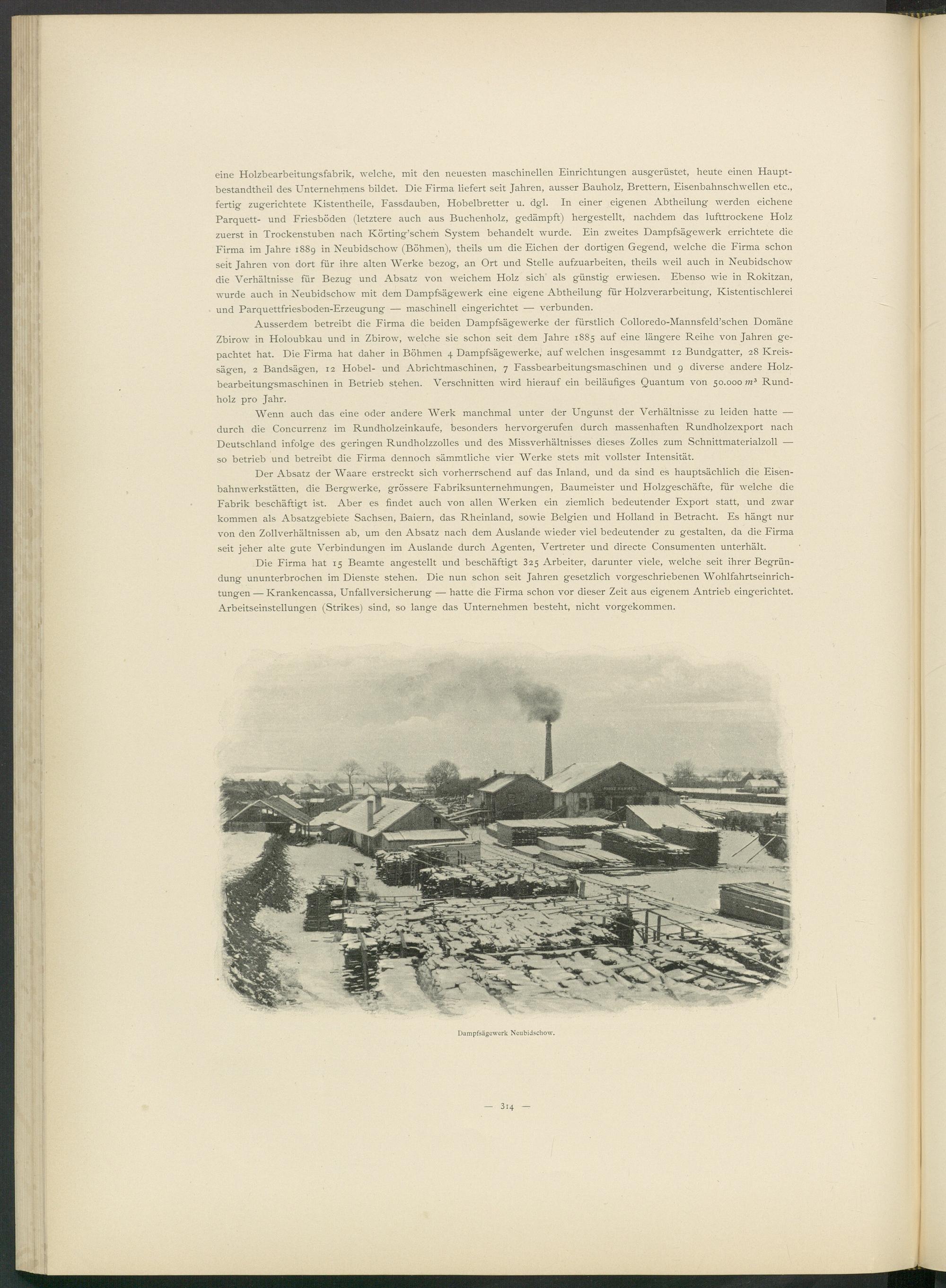 Ausserdem betreibt die Firma die beiden Dampfsägewerke der fürstlich Colloredo-Mannsfeld’schen Domäne Zbirow in Holoubkau und in Zbirow, welche sie schon seit dem Jahre 1885 auf eine längere Reihe von Jahren gepachtet hat. Die Firma hat daher in Böhmen 4 Dampfsägewerke, auf welchen insgesammt 12 Bundgatter, 28 Kreissägen, 2 Bandsägen, 12 Hobel- und Abrichtmaschinen, 7 Fassbearbeitungsmaschinen und 9 diverse andere Holzbearbeitungsmaschinen in Betrieb stehen. Verschnitten wird hierauf ein beiläufiges Quantum von 50.000 m 3 Rundholz pro Jahr.