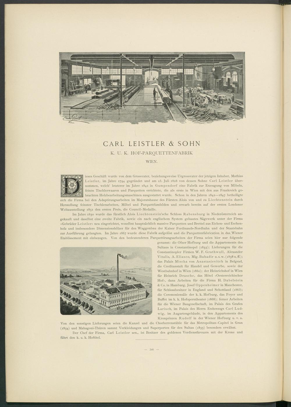 ieses Geschäft wurde von dem Grossvater, beziehungsweise Urgrossvater der jetzigen Inhaber, Mathias Leistier, im Jahre 1794 gegründet und am 23. Juli 1828 von dessen Sohne Carl Leistier übernommen, welch’ letzterer im Jahre 1842 in Gumpendorf eine Fabrik zur Erzeugung von Möbeln, feinen Tischlerwaaren und Parquetten errichtete, die als erste in Wien mit den aus Frankreich gebrachten Holzbearbeitungsmaschinen ausgestattet wurde. Schon in den Jahren 1842—1847 betheiligte sich die Firma bei den Adaptirungsarbeiten im Majoratshause des Fürsten Alois von und zu Liechtenstein durch Herstellung feinster Tischlerarbeiten, Möbel und Parquettfussböden und erwarb bereits auf der ersten Londoner Weltausstellung 1851 den ersten Preis, die Council-Medaille.
