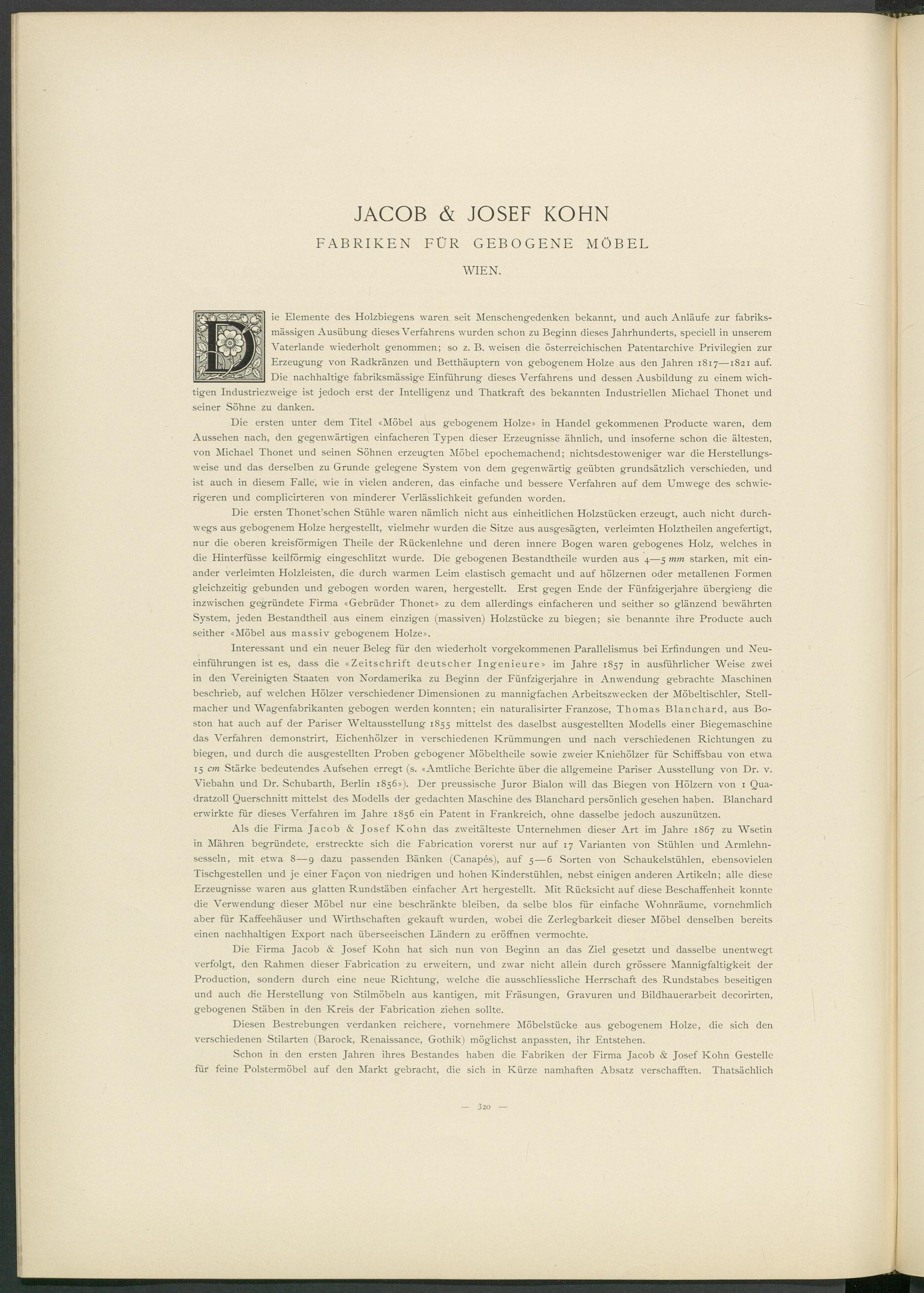 ie Elemente des Holzbiegens waren seit Menschengedenken bekannt, und auch Anläufe zur fabriks- mässigen Ausübung dieses Verfahrens wurden schon zu Beginn dieses Jahrhunderts, speciell in unserem Vaterlande wiederholt genommen; so z. B. weisen die österreichischen Patentarchive Privilegien zur Erzeugung von Radkränzen und Betthäuptern von gebogenem Holze aus den Jahren 1817—1821 auf. Die nachhaltige fabriksmässige Einführung dieses Verfahrens und dessen Ausbildung zu einem wichtigen Industriezweige ist jedoch erst der Intelligenz und Thatkraft des bekannten Industriellen Michael Thonet und seiner Söhne zu danken.