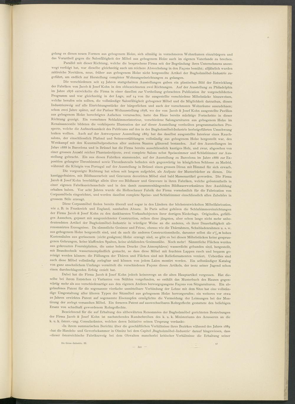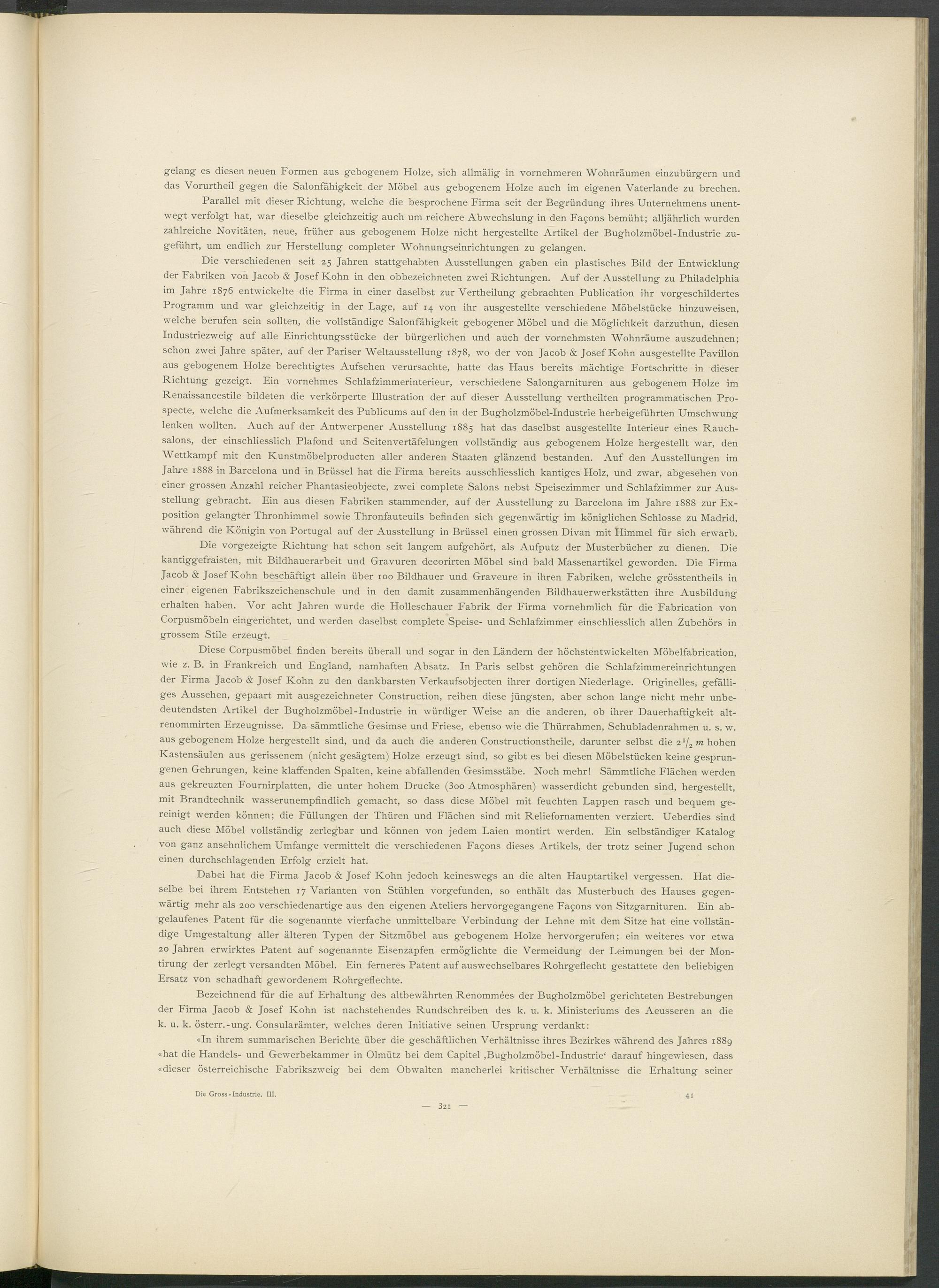 «In ihrem summarischen Berichte über die geschäftlichen Verhältnisse ihres Bezirkes während des Jahres 1889 «hat die Handels- und Gewerbekammer in Olmütz bei dem Capitel ,Bugholzmöbel-Industrie' darauf hingewiesen, dass «dieser österreichische Fabrikszweig bei dem Obwalten mancherlei kritischer Verhältnisse die Erhaltung seiner