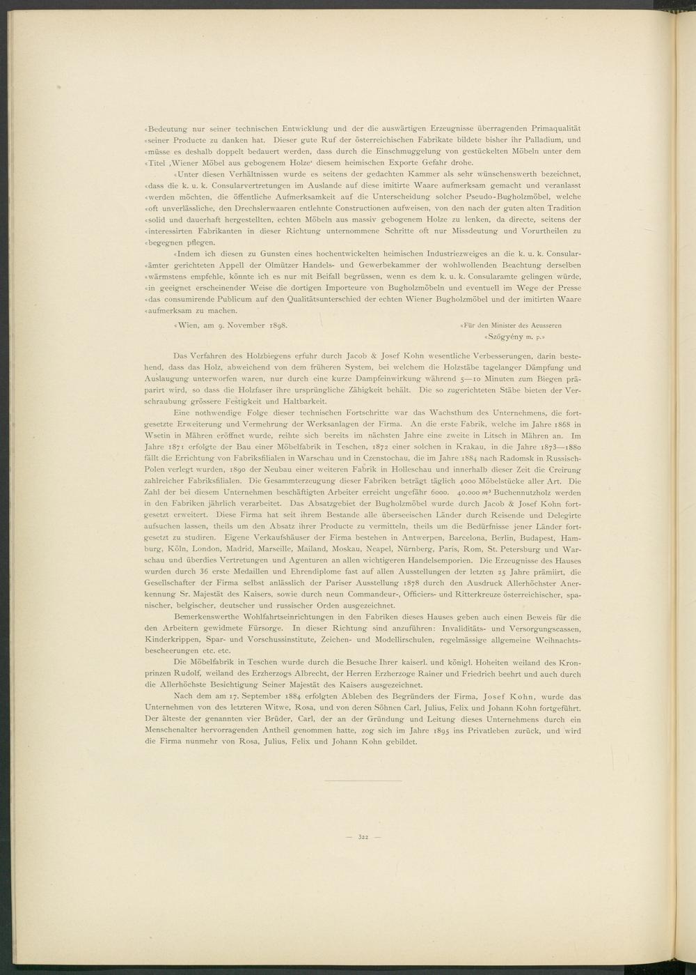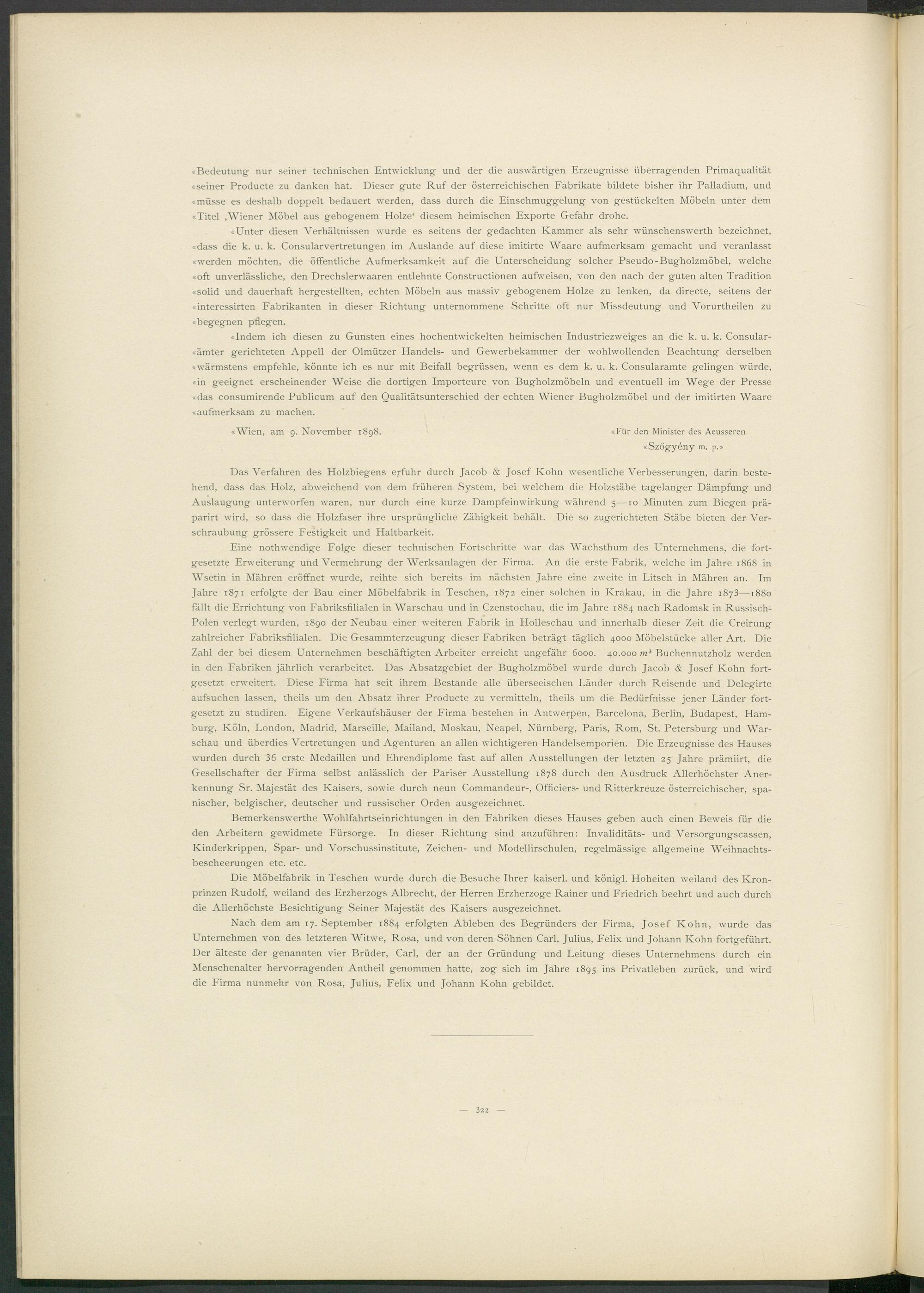 «Unter diesen Verhältnissen wurde es seitens der gedachten Kammer als sehr wünschenswerth bezeichnet, «dass die k. u. k. Consularvertretungen im Auslande auf diese imitirte Waare aufmerksam gemacht und veranlasst «werden möchten, die öffentliche Aufmerksamkeit auf die Unterscheidung solcher Pseudo-Bugholzmöbel, welche «oft unverlässliche, den Drechslerwaaren entlehnte Constructionen aufweisen, von den nach der guten alten Tradition «solid und dauerhaft hergestellten, echten Möbeln aus massiv gebogenem Holze zu lenken, da directe, seitens der «interessirten Fabrikanten in dieser Richtung unternommene Schritte oft nur Missdeutung und Vorurtheilen zu «begegnen pflegen.