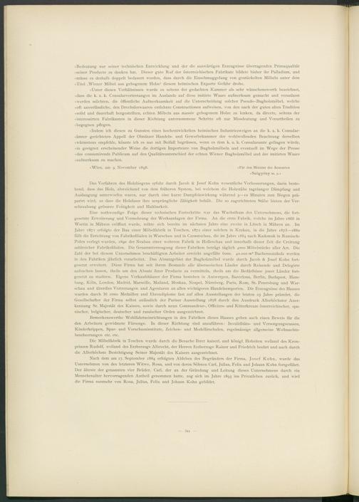 «Indem ich diesen zu Gunsten eines hochentwickelten heimischen Industriezweiges an die k. u. k. Consular- «ämter gerichteten Appell der Olmützer Handels- und Gewerbekammer der wohlwollenden Beachtung derselben «wärmstens empfehle, könnte ich es nur mit Beifall begrüssen, wenn es dem k. u. k. Consularamte gelingen würde, «in geeignet erscheinender Weise die dortigen Importeure von Bugholzmöbeln und eventuell im Wege der Presse «das consumirende Publicum auf den Qualitätsunterschied der echten Wiener Bugholzmöbel und der imitirten Waare «aufmerksam zu machen.