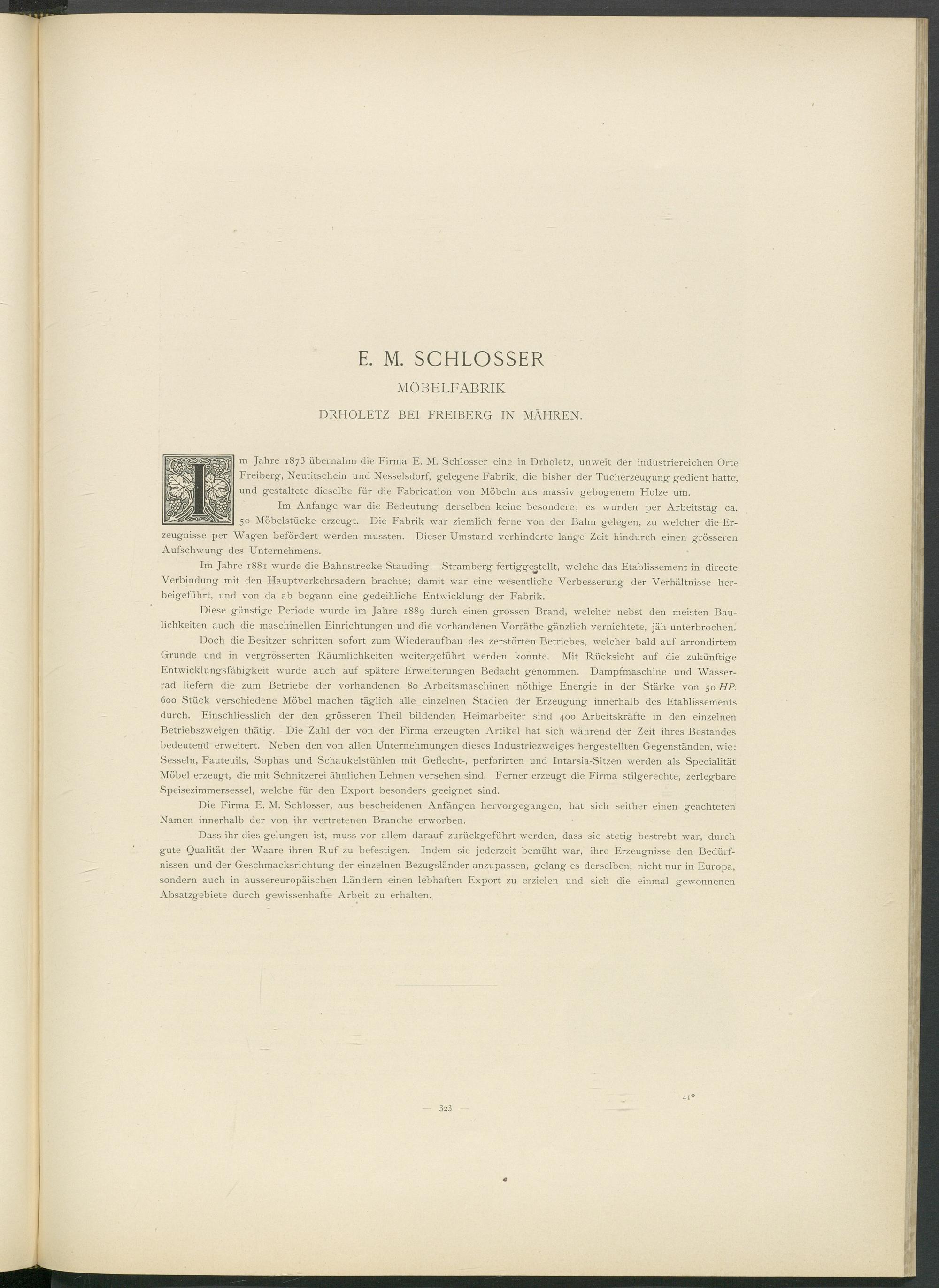m Jahre 1873 übernahm die Firma E. M. Schlosser eine in Drholetz, unweit der industriereichen Orte Freiberg, Neutitschein und Nesselsdorf, gelegene Fabrik, die bisher der Tucherzeugung gedient hatte, und gestaltete dieselbe für die Fabrication von Möbeln aus massiv gebogenem Holze um.