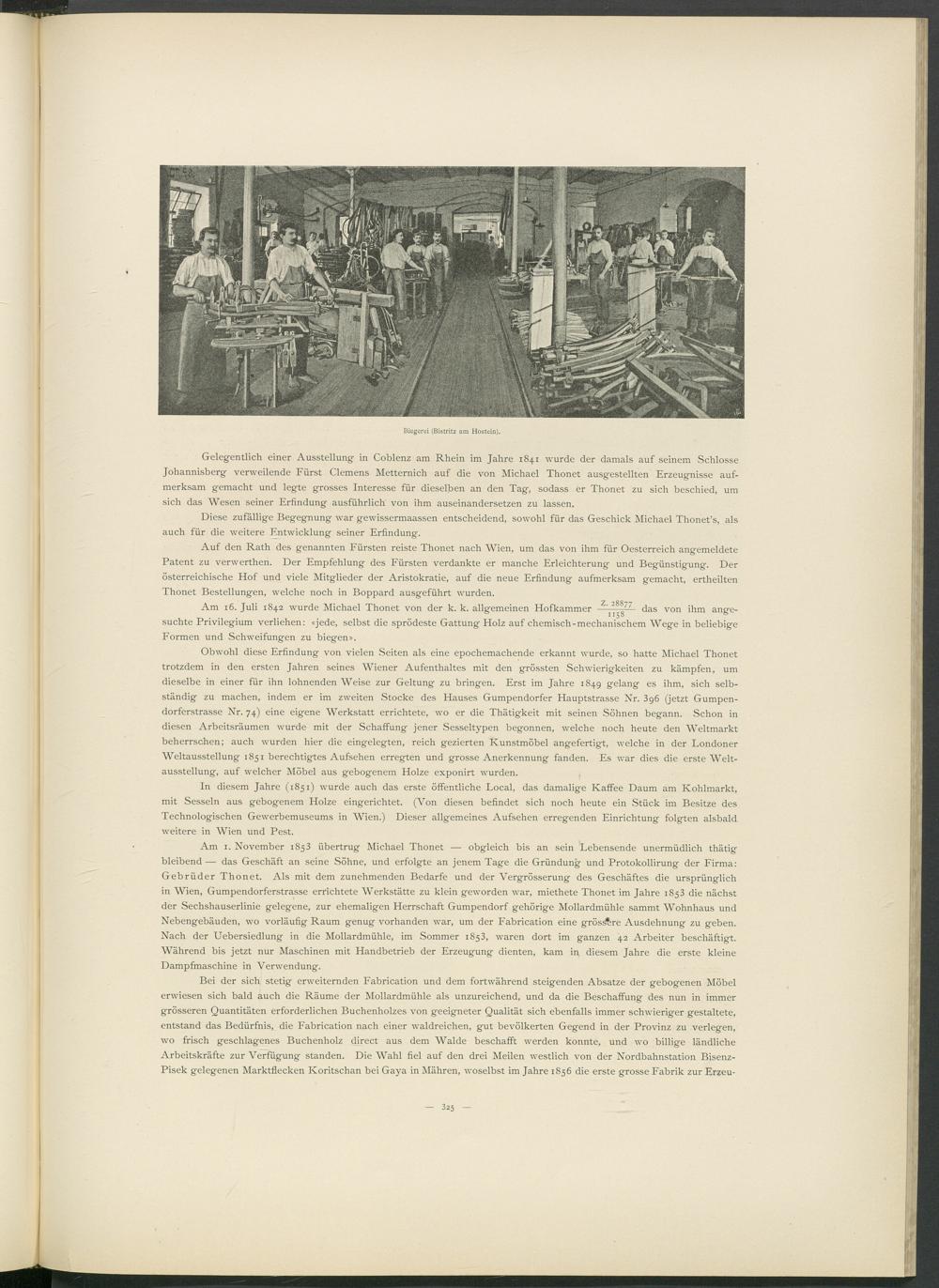 Bei der sich stetig erweiternden Fabrication und dem fortwährend steigenden Absätze der gebogenen Möbel erwiesen sich bald auch die Räume der Mollardmühle als unzureichend, und da die Beschaffung des nun in immer grösseren Quantitäten erforderlichen Buchenholzes von geeigneter Qualität sich ebenfalls immer schwieriger gestaltete, entstand das Bedürfnis, die Fabrication nach einer waldreichen, gut bevölkerten Gegend in der Provinz zu verlegen, wo frisch geschlagenes Buchenholz direct aus dem Walde beschafft werden konnte, und wo billige ländliche Arbeitskräfte zur Verfügung standen. Die Wahl fiel auf den drei Meilen westlich von der Nordbahnstation Bisenz- Pisek gelegenen Marktflecken Koritschan bei Gaya in Mähren, woselbst im Jahre 1856 die erste grosse Fabrik zur Erzeu-