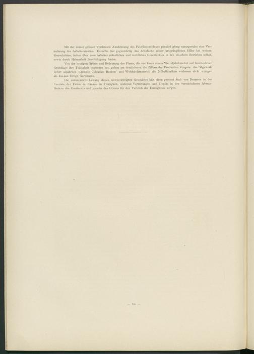 Von der heutigen Grösse und Bedeutung der Firma, die vor kaum einem Vierteljahrhundert auf bescheidener Grundlage ihre Thätigkeit begonnen hat, geben am deutlichsten die Ziffern der Production Zeugnis: das Sägewerk liefert alljährlich 1,500.000 Cubikfuss Buchen- und Weichholzmaterial, die Möbelfabriken verlassen nicht weniger als 3 oo.ooo fertige Garnituren.