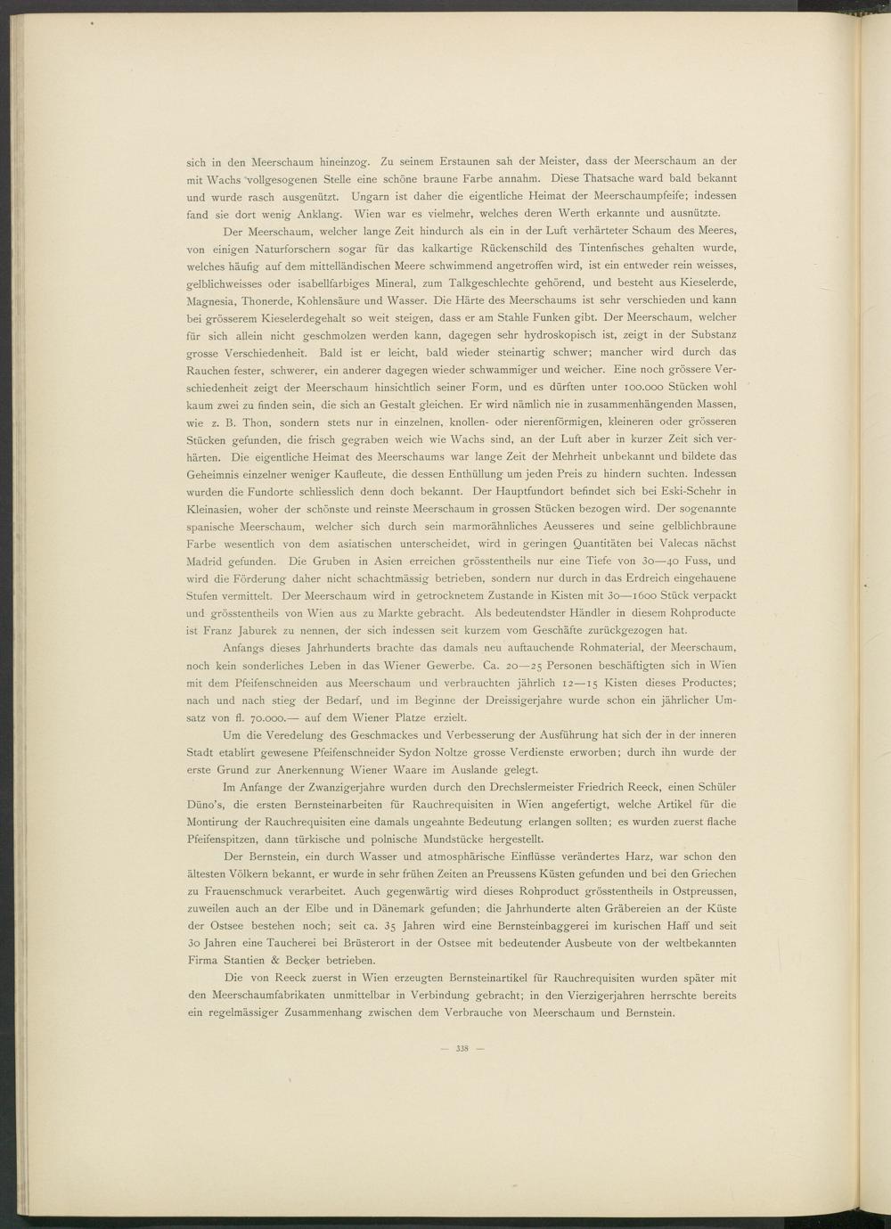 Anfangs dieses Jahrhunderts brachte das damals neu auftauchende Rohmaterial, der Meerschaum, noch kein sonderliches Leben in das Wiener Gewerbe. Ca. 20—25 Personen beschäftigten sich in Wien mit dem Pfeifenschneiden aus Meerschaum und verbrauchten jährlich 12 —15 Kisten dieses Productes; nach und nach stieg der Bedarf, und im Beginne der Dreissigerjahre wurde schon ein jährlicher Umsatz von fl. 70.000. —- auf dem Wiener Platze erzielt.