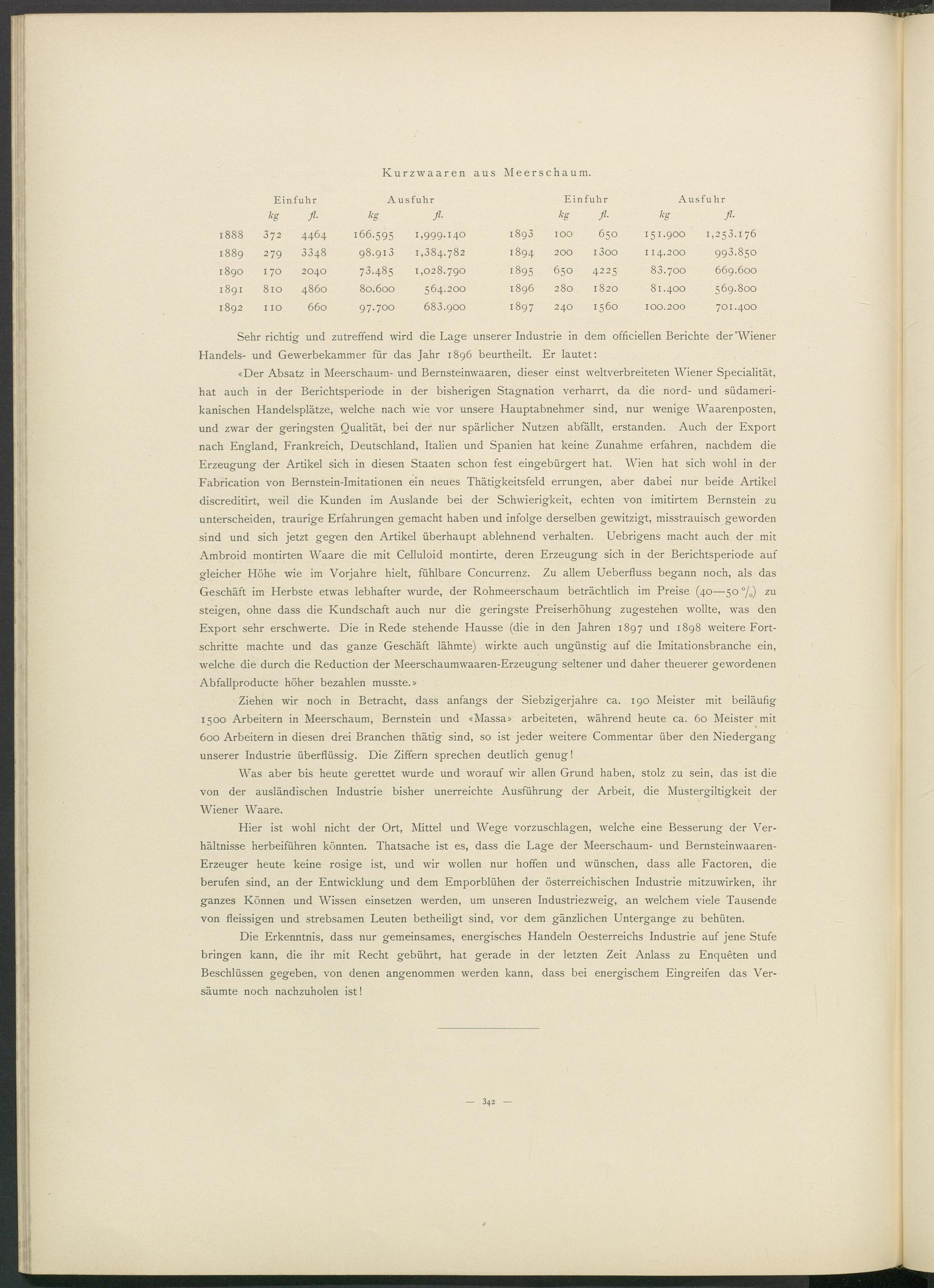 «Der Absatz in Meerschaum- und Bernsteinwaaren, dieser einst weltverbreiteten Wiener Specialität, hat auch in der Berichtsperiode in der bisherigen Stagnation verharrt, da die nord- und südamerikanischen Handelsplätze, welche nach wie vor unsere Hauptabnehmer sind, nur wenige Waarenposten, und zwar der geringsten Qualität, bei der nur spärlicher Nutzen abfällt, erstanden. Auch der Export nach England, Frankreich, Deutschland, Italien und Spanien hat keine Zunahme erfahren, nachdem die Erzeugung der Artikel sich in diesen Staaten schon fest eingebürgert hat. Wien hat sich wohl in der Fabrication von Bernstein-Imitationen ein neues Thätigkeitsfeld errungen, aber dabei nur beide Artikel discreditirt, weil die Kunden im Auslande bei der Schwierigkeit, echten von imitirtem Bernstein zu unterscheiden, traurige Erfahrungen gemacht haben und infolge derselben gewitzigt, misstrauisch geworden sind und sich jetzt gegen den Artikel überhaupt ablehnend verhalten. Uebrigens macht auch der mit Ambroid montirten Waare die mit Celluloid montirte, deren Erzeugung sich in der Berichtsperiode auf gleicher Höhe wie im Vorjahre hielt, fühlbare Concurrenz. Zu allem Ueberfluss begann noch, als das Geschäft im Herbste etwas lebhafter wurde, der Rohmeerschaum beträchtlich im Preise (40—50 °/ 0 ) zu steigen, ohne dass die Kundschaft auch nur die geringste Preiserhöhung zugestehen wollte, was den Export sehr erschwerte. Die in Rede stehende Hausse (die in den Jahren 1897 und 1898 weitere Fortschritte machte und das ganze Geschäft lähmte) wirkte auch ungünstig auf die Imitationsbranche ein, welche die durch die Reduction der Meerschaumwaaren-Erzeugung seltener und daher theuerer gewordenen Abfallproducte höher bezahlen musste.»