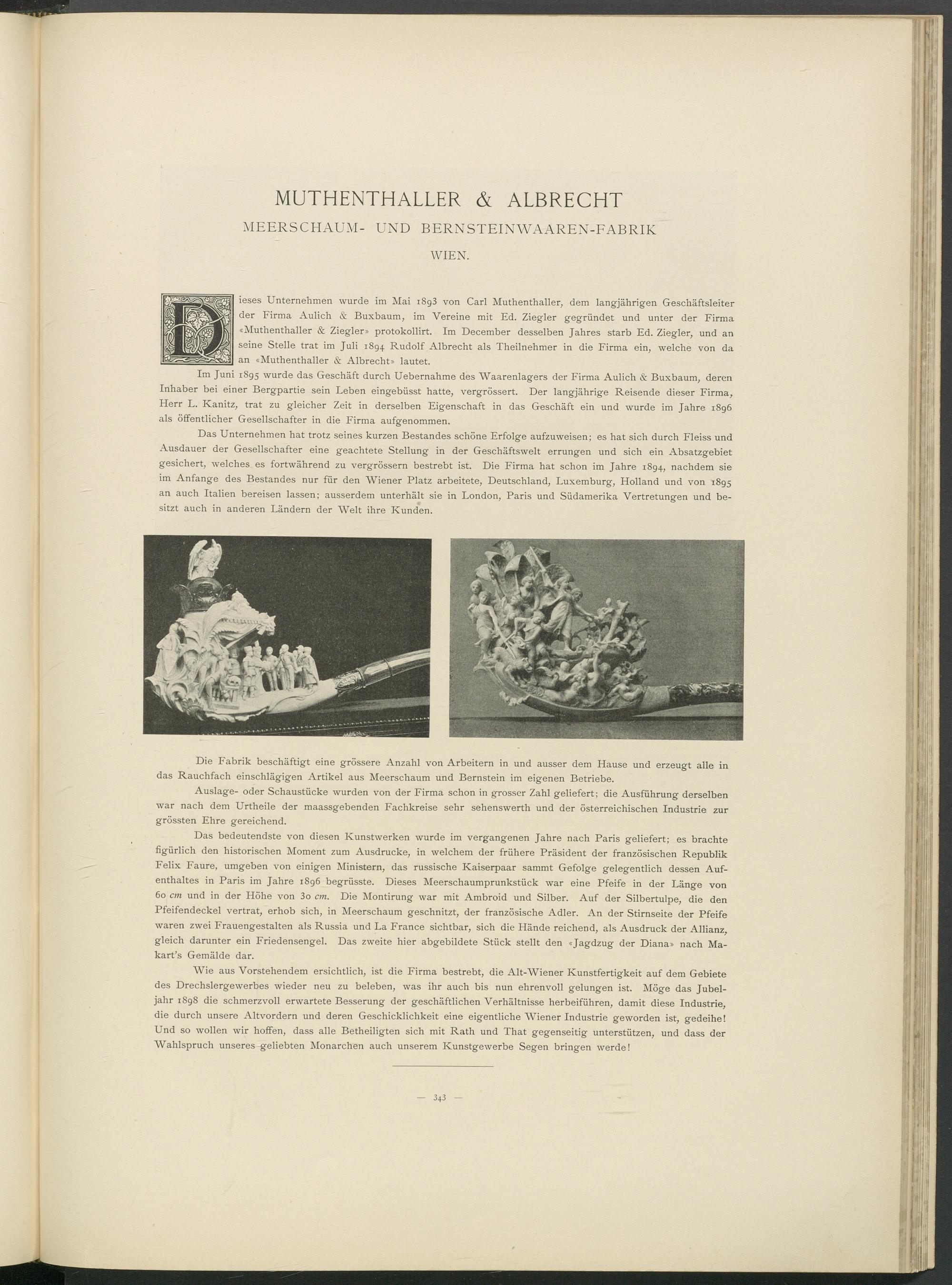 Die Fabrik beschäftigt eine grössere Anzahl von Arbeitern in und ausser dem Hause und erzeugt alle in das Rauchfach einschlägigen Artikel aus Meerschaum und Bernstein im eigenen Betriebe.