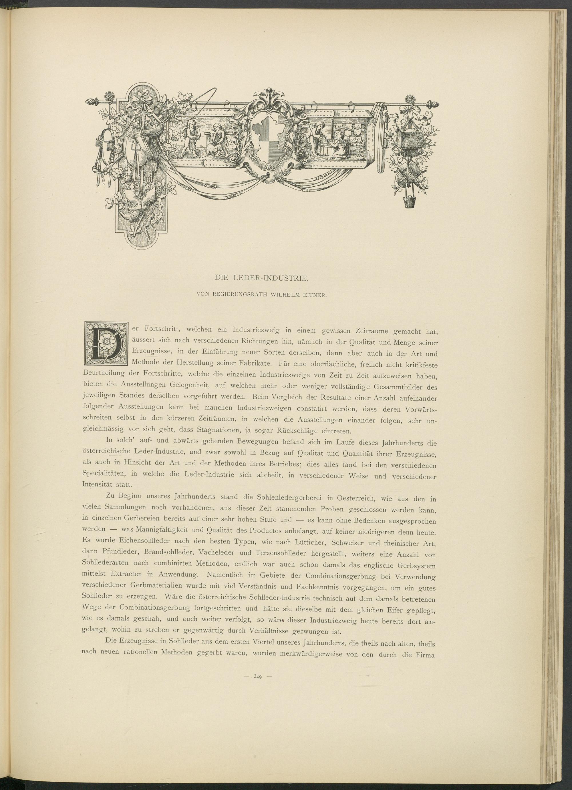In solch’ auf- und abwärts gehenden Bewegungen befand sich im Laufe dieses Jahrhunderts die österreichische Leder-Industrie, und zwar sowohl in Bezug auf Qualität und Quantität ihrer Erzeugnisse, als auch in Hinsicht der Art und der Methoden ihres Betriebes; dies alles fand bei den verschiedenen Specialitäten, in welche die Leder-Industrie sich abtheilt, in verschiedener Weise und verschiedener Intensität statt.