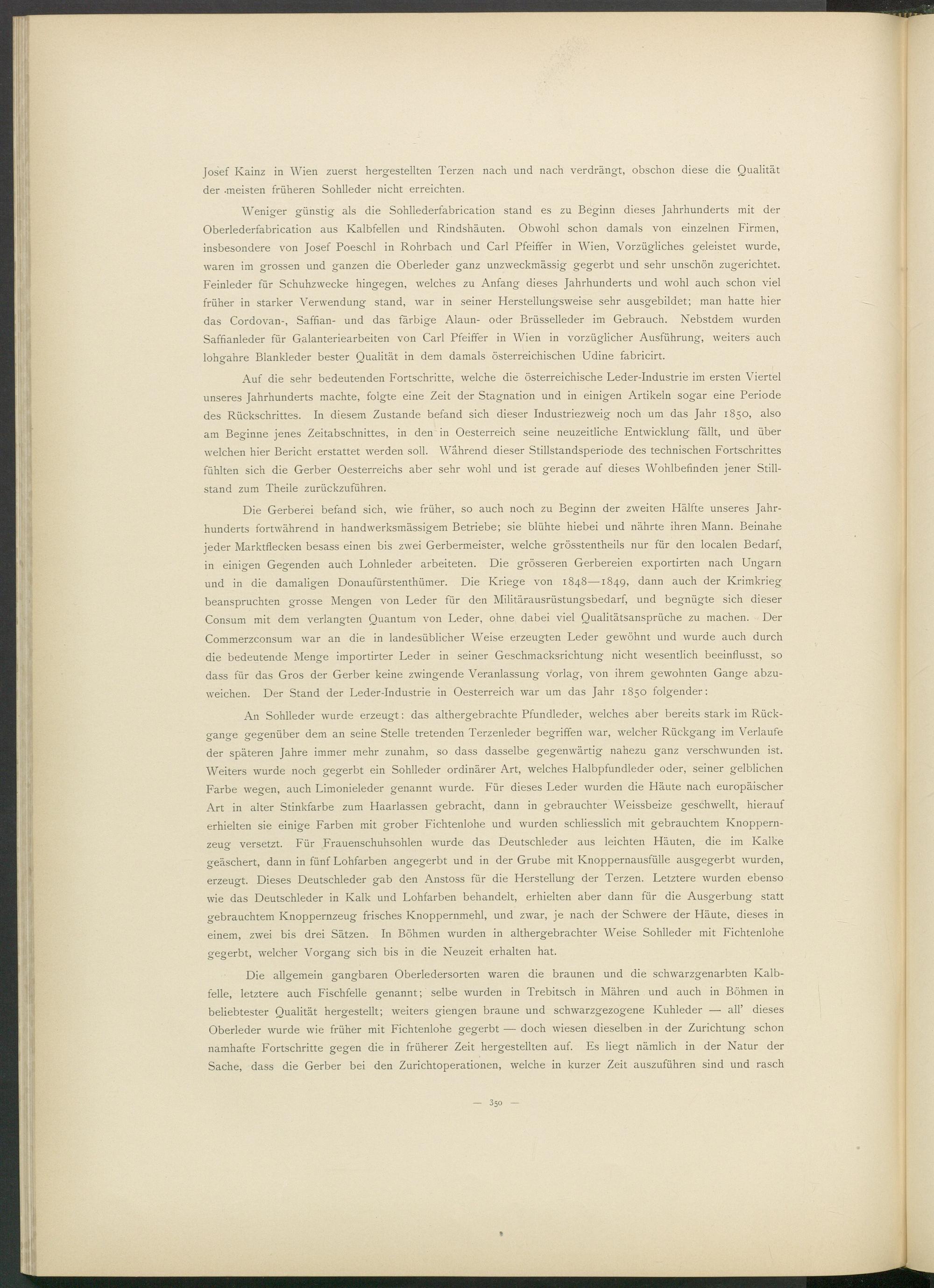 Weniger günstig als die Sohllederfabrication stand es zu Beginn dieses Jahrhunderts mit der Oberlederfabrication aus Kalbfellen und Rindshäuten. Obwohl schon damals von einzelnen Firmen, insbesondere von Josef Poeschl in Rohrbach und Carl Pfeiffer in Wien, Vorzügliches geleistet wurde, waren im grossen und ganzen die Oberleder ganz unzweckmässig gegerbt und sehr unschön zugerichtet. Feinleder für Schuhzwecke hingegen, welches zu Anfang dieses Jahrhunderts und wohl auch schon viel früher in starker Verwendung stand, war in seiner Herstellungsweise sehr ausgebildet; man hatte hier das Cordovan-, Saffian- und das färbige Alaun- oder Brüsselleder im Gebrauch. Nebstdem wurden Saffianleder für Galanteriearbeiten von Carl Pfeiffer in Wien in vorzüglicher Ausführung, weiters auch lohsrahre Blankleder bester Oualität in dem damals österreichischen Udine fabricirt.