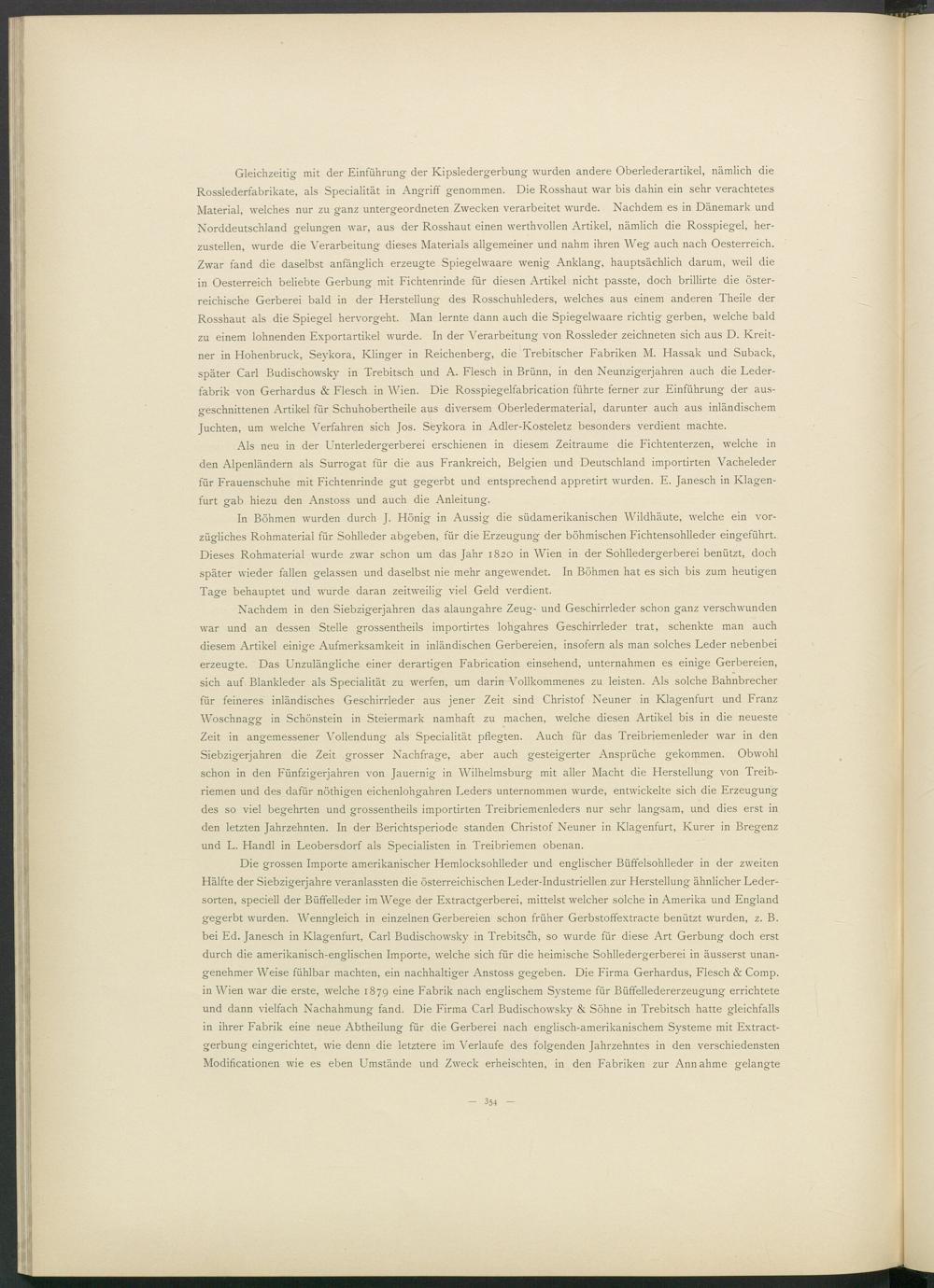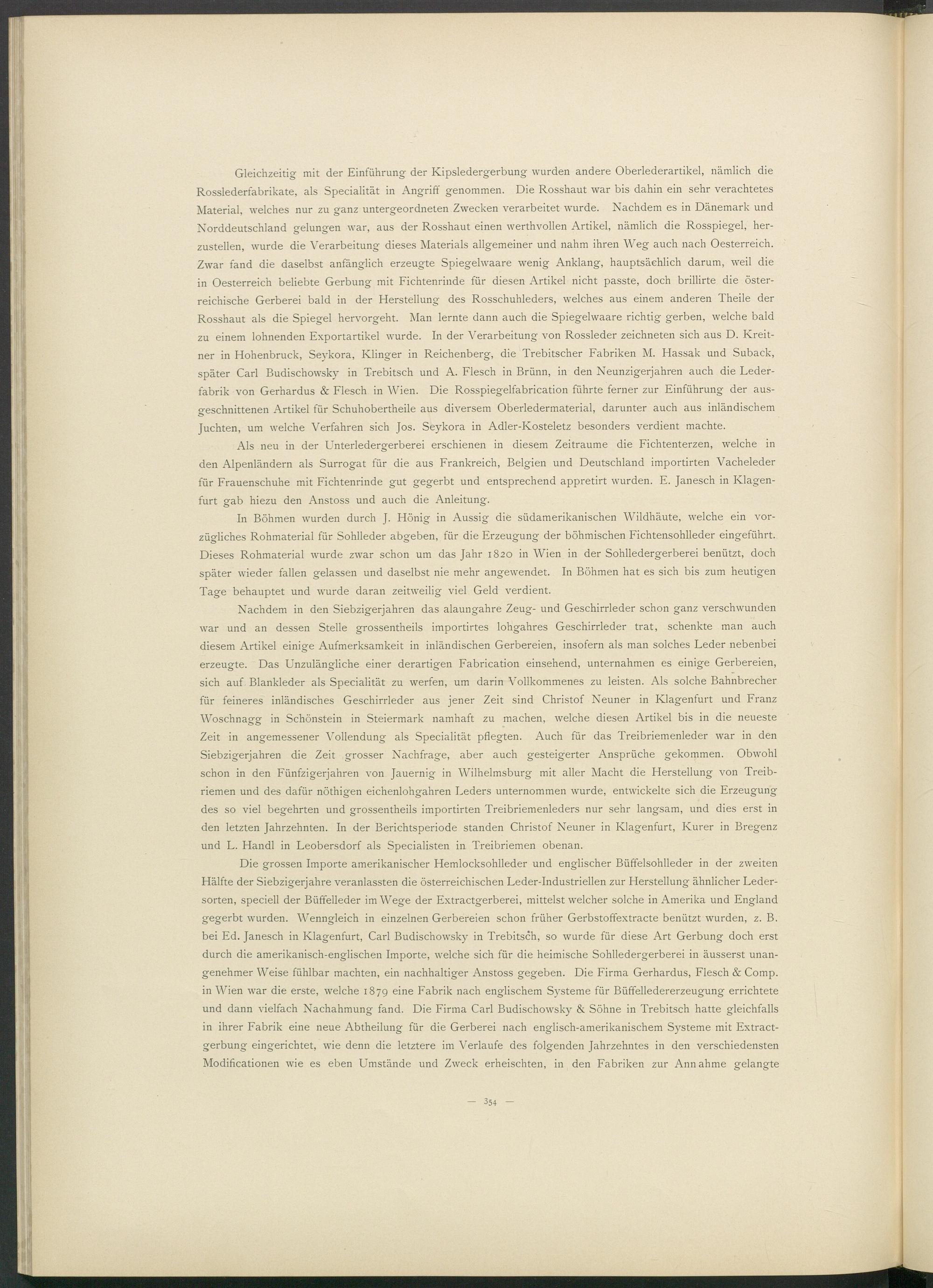 Die grossen Importe amerikanischer Hemlocksohlleder und englischer Büffelsohlleder in der zweiten Hälfte der Siebzigerjahre veranlassten die österreichischen Leder-Industriellen zur Herstellung ähnlicher Ledersorten, speciell der Büffelleder im Wege der Extractgerberei, mittelst welcher solche in iMnerika und England gegerbt wurden. Wenngleich in einzelnen Gerbereien schon früher Gerbstoffextracte benützt wurden, z. B. bei Ed. Janesch in Klagenfurt, Carl Budischowsky in Trebitsch, so wurde für diese Art Gerbung doch erst durch die amerikanisch-englischen Importe, welche sich für die heimische Sohlledergerberei in äusserst unangenehmer Weise fühlbar machten, ein nachhaltiger Anstoss gegeben. Die Firma Gerhardus, Flesch & Comp, in Wien war die erste, welche 1879 e i ne Fabrik nach englischem Systeme für Büffelledererzeugung errichtete und dann vielfach Nachahmung fand. Die Firma Carl Budischowsky & Söhne in Trebitsch hatte gleichfalls in ihrer Fabrik eine neue Abtheilung für die Gerberei nach englisch-amerikanischem Systeme mit Extract- gerbung eingerichtet, wie denn die letztere im Verlaufe des folgenden Jahrzehntes in den verschiedensten Modificationen wie es eben Umstände und Zweck erheischten, in den Fabriken zur Annahme eelansde