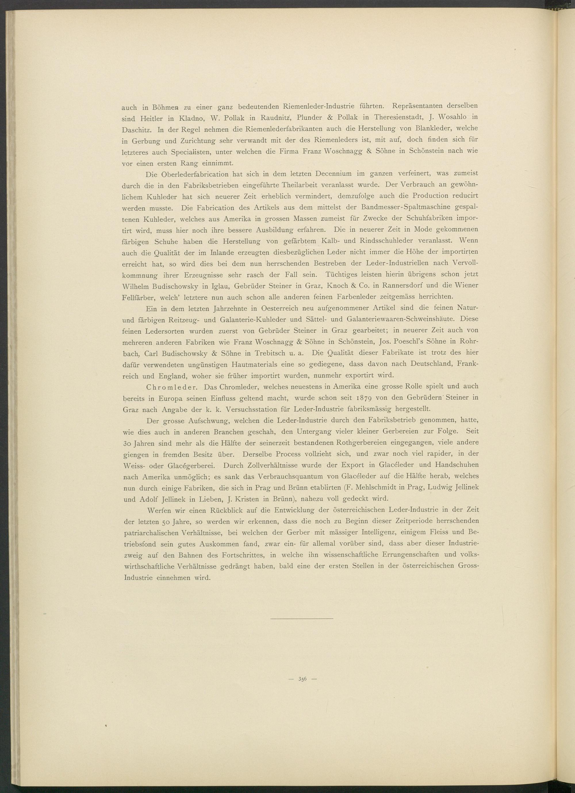 Der grosse Aufschwung, welchen die Leder-Industrie durch den Fabriksbetrieb genommen, hatte, wie dies auch in anderen Branchen geschah, den Untergang vieler kleiner Gerbereien zur Folge. Seit 3 o Jahren sind mehr als die Hälfte der seinerzeit bestandenen Rothgerbereien eingegangen, viele andere giengen in fremden Besitz über. Derselbe Process vollzieht sich, und zwar noch viel rapider, in der Weiss- oder Glacegerberei. Durch Zollverhältnisse wurde der Export in Glaceleder und Handschuhen nach Amerika unmöglich; es sank das Verbrauchsquantum von Glacöleder auf die Hälfte herab, welches nun durch einige Fabriken, die sich in Prag und Brünn etablirten (F. Mehlschmidt in Prag, Ludwig Jellinek und Adolf Jellinek in Lieben, J. Kristen in Brünn), nahezu voll gedeckt wird.