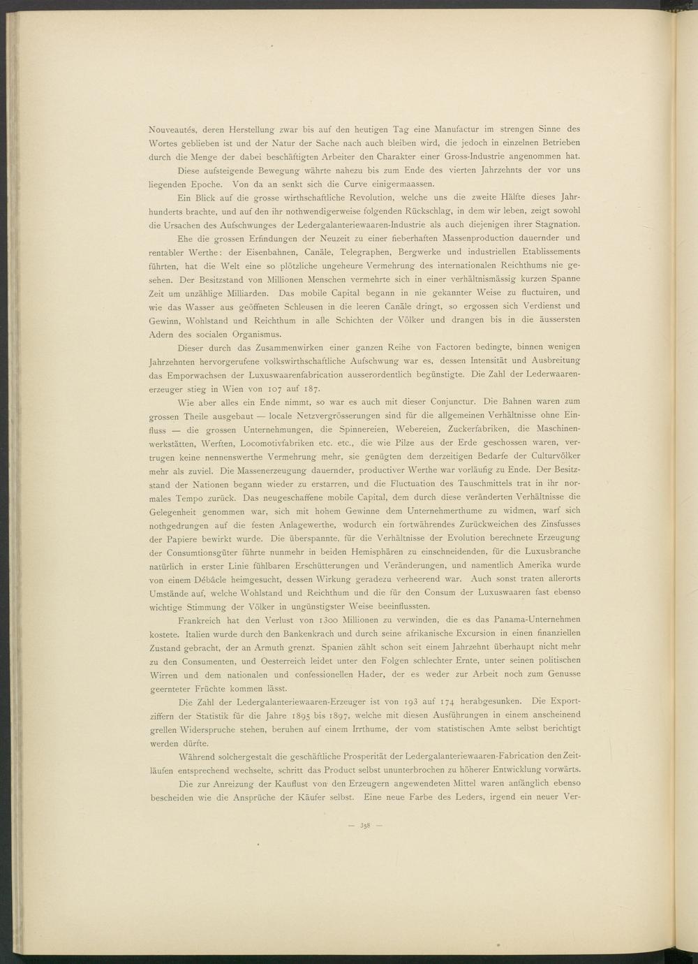 Dieser durch das Zusammenwirken einer ganzen Reihe von Factoren bedingte, binnen wenigen Jahrzehnten hervorgerufene volkswirthschaftliche Aufschwung war es, dessen Intensität und Ausbreitung das Emporwachsen der Luxuswaarenfabrication ausserordentlich begünstigte. Die Zahl der Lederwaaren- erzeuger stieg in Wien von 107 auf 187.